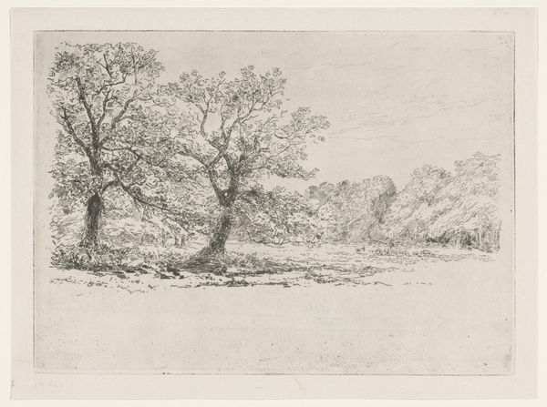 Curator: Here we have William Collins' "Study of Trees," held in the Tate collection. There's no exact date, but Collins lived from 1788 to 1847. Editor: It feels like a memory, a quiet whisper of nature. I'm drawn to the almost skeletal quality of the central tree—its branches reaching like tentative fingers. Curator: Absolutely. Collins, in his commitment to sketching from nature, invites us to consider the very process of observation and replication. The paper itself shows the labor of creation. Editor: I find it deeply personal, this act of capturing the ephemeral. It's as if he's trying to hold onto something intangible, maybe the feeling of being in that very spot. I feel the need to wander. Curator: Indeed, we must always consider our own situatedness as the viewer of landscape and the labor required to produce these fleeting moments. Editor: Maybe it's a lesson on how to properly observe, to truly absorb the world around us before it vanishes.