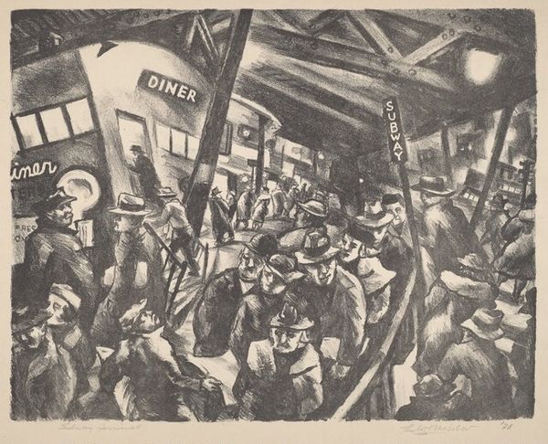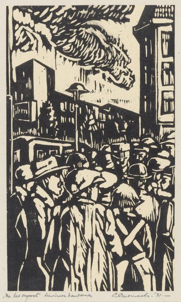 Curator: This piece practically hums with suppressed energy. It’s Fayga Ostrower's "Fontamara VIII" from 1947, a woodcut print brimming with raw emotion. Editor: Yes, that heavy contrast creates a claustrophobic feeling, doesn't it? Almost oppressive. You're immediately confronted by this crowd... or is it a mob? There's a simmering tension that grabs you. Curator: The term "mob" feels right, I think! There's a certain density to the crowd—faces are obscured. The way Ostrower renders the architecture, all sharp angles, looming shadows... it suggests a space both confining and vulnerable. It gives the impression that they are about to reach a specific place and something is about to occur. Editor: Definitely. Visually, the flags hanging overhead have an ominous feel rather than celebratory, but they indicate the presence of political figures. To me, this reads like the prelude to something unsettling; perhaps a moment of revolution. Black and white seem to indicate clarity, truth and honesty but instead these high contrast gives the idea that something is hidden under the eyes. The people in the painting can't truly perceive. Curator: That use of black and white is brilliant, truly! It intensifies everything. Knowing the historical context, post-war Brazil and a climate of political instability, it's tempting to read these people as being poised on a knife’s edge of uncertainty. There is a need for political power. Ostrower did experiment a lot in abstract and informal languages which lead me to believe that she also liked experimenting with chaos within structures. Editor: Yes, the figures almost melt together as shapes and forms in the overall compositions, and that almost obscures their individual humanity. But the upward movement towards the political characters also reminds the viewer of how desperately and in which measures these people look for justice. Is it fair? Will justice be reached? Or will those leaders abuse of such desire? These are all question and signs left and right in this piece, for us to think and re-think about it. Curator: Absolutely. "Fontamara VIII" is an enduring meditation on society, power, and the weight of history. Editor: I completely agree. Its stark imagery truly continues to resonate today.