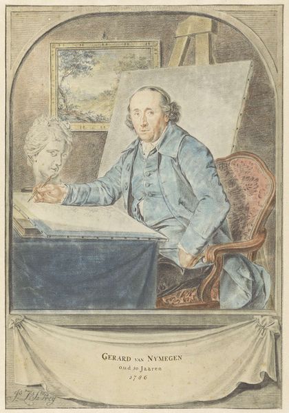 This self-portrait was made by Jurriaan Andriessen, a Dutch artist, using pen and brush in watercolor, somewhere around the late 18th or early 19th century. The artwork uses traditional materials and techniques. The layered effect of watercolor gives the portrait a soft, almost dreamlike quality. You can almost feel the artist's gaze, steady and self-assured, as he depicts himself at work. Andriessen clearly wanted to present himself as a cultivated man of his time, and that meant showing himself at work – engaged in the act of creation. Note the painting on the easel, rendered with the same care as his own face. The scene is bathed in a warm light, suggesting an idealized vision of the artist at work. This portrait speaks to the changing status of artists in the 18th century, as they sought to elevate themselves from mere artisans to intellectuals, mirroring the values of their time. It reminds us that art is always tied to the social and cultural context in which it's made.
