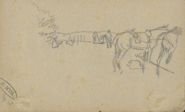 Curator: Looking at this page, you get the impression of something quickly captured. It's George Hendrik Breitner's "Compositiestudie met ruiters," a composition study with riders, likely created between 1886 and 1890. It’s currently held here at the Rijksmuseum. You can see he has worked with pencil and possibly ink. Editor: Yes, a sense of raw, restless energy definitely comes through. The sketchiness lends it an almost dreamlike quality, like a memory fading at the edges. Curator: Breitner was known for documenting the bustling city life of Amsterdam, particularly through photography and painting. This preliminary drawing perhaps shows his process, rapidly fixing fleeting images of daily life, like soldiers or workmen, within his sketchbooks, to be reworked later. Do you read these figures as soldiers on horses? Editor: Soldiers or laborers returning, maybe? The figures have this collective quality about them—they’re certainly not individual portraits. What resonates with me is how universally evocative the scene still is. Even though these are 19th-century riders, they reflect something primal, perhaps linked to human transit, conquest, and the domestication of animals over millennia. It is about a collective moving. Curator: It's true, this speaks beyond one singular moment. I think we can find traces in these images of Romanticism: Man in motion is always charged with dynamism and destiny, a constant pushing of limits... The very act of sketching is fascinating: you want to try an arrangement quickly to test some compositional solution, maybe just trying to suggest direction with broad strokes, which contributes to that emotional charge. Editor: Absolutely. It also invites the viewer into Breitner’s world, like a visual note left for us to find. I was thinking about the position of sketch in academic history: there were lots of atelier practices during that period, but sketchbooks had very individual character and represented something raw. You're showing the artist's "workings." What he has created *before* reaching perfection. The incompleteness becomes a source of significance. Curator: Perhaps that’s what gives it such lasting appeal. The imperfection of art-making. Thanks to this little gem, we are given access to something essential in art: process itself. Editor: Indeed, thank you for illuminating the image and the importance of what is shown through sketch, an entry point to the mind of an artist and to deeper collective meanings of artmaking through centuries.