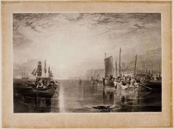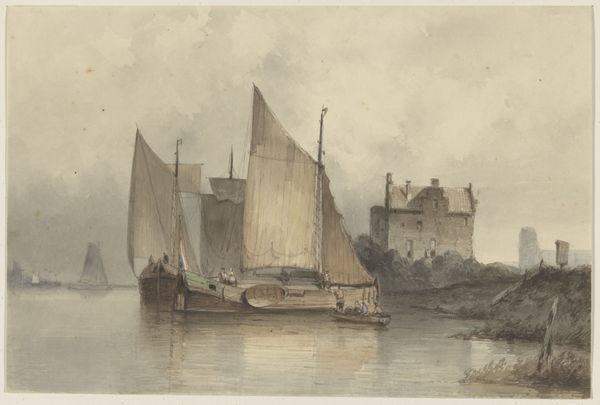 Curator: John Thirtle's "Old Lynn" presents a bustling waterfront scene, rendered in watercolor on paper. Editor: My first impression is the muted tonality; a melancholic quality pervades this port. Curator: Note how Thirtle employs a skillful arrangement of forms, the way the linear thrust of the masts counters the horizontal landscape elements. Consider the interplay of light and shadow. Editor: The masts indeed draw the eye upward, but I also see the flags atop them, suggesting trade and connection. Even the smoke rising points toward industry and human activity. Curator: The composition demonstrates a clear understanding of pictorial structure. The precise arrangement of the scene’s components enhances its stability and balance. Editor: Stability, yes, but also a sense of change—the medieval tower juxtaposed with contemporary commerce hints at the passage of time. Curator: Precisely, it's a study in contrasts within a unified pictorial field. Editor: It's a poignant image, evoking both progress and a certain nostalgia.