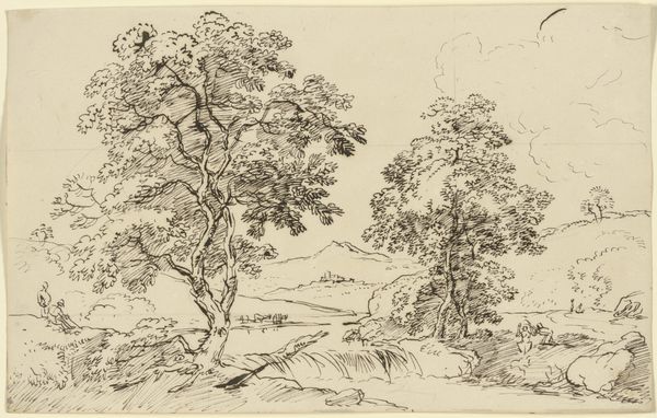 Curator: Here we have Franz Kobell's "Lakeside," a striking landscape study housed here at the Städel Museum. It's executed with pen and ink. What's your immediate impression? Editor: Restful, yet a bit melancholic. The tight hatching gives it a sense of stillness, as if the air itself is heavy and damp. Curator: That's a keen observation. It's worth noting how Kobell employs these hatching techniques to give shape to a certain period of romantic longing for simpler representations of nature. He seems to want to suggest a timeless communion. What's so potent to me is how this sort of natural depiction became, by the nineteenth century, its own kind of cultural signifier. Editor: Absolutely, and this kind of scene evokes that shift from agriculture to industrialization, that sentimental view of rurality, even now, really. The twisting tree in the foreground—almost anthropomorphic, wouldn't you say?— adds a layer of meaning to the romantic connection of humanity with nature, how they can even look similar. Curator: Indeed, it anchors the whole composition! In a symbolic language, trees have deep roots in collective thought as representing growth, stability, and a connection to the earth and ancestry. Editor: I can see how Kobell taps into that. Though his depiction is specific, the details blur into a broader evocation of nature. The way that he represents those trees surrounding the image is masterful. Curator: Agreed. What interests me is how art institutions, especially in urban centres, create the value associated with landscapes like this. In a period of urbanization, these nature scenes acquired an enormous nostalgia value in people's mind. Editor: Exactly. They become commodities representing an increasingly idealized version of 'country life.' So, this deceptively simple sketch, "Lakeside," encapsulates a range of complicated historical, social and emotional baggage, when you think about it. Curator: Absolutely, "Lakeside," through ink on paper, shows that how we project these symbolic values has changed and endured. Editor: For me, Kobell's drawing leaves me wondering about the artist's intent when representing such landscape, which certainly resonates through generations of representations.