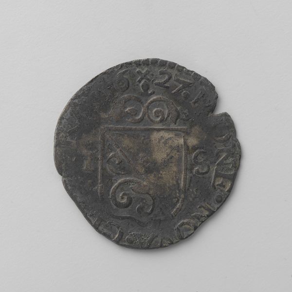 Curator: This intriguing coin, created around 1421-1422, is called “Hollandse penning met de lopende leeuw van Jan van Beieren.” The piece, made of metal, is miniature, so it's difficult to read its imagery clearly from afar. Editor: Despite its size, I immediately sense the weight of history and power emanating from it, even through its tarnished surface. It seems so tangible. Curator: Indeed. Let's look at its composition. Note the concentric rings: an inner field featuring a walking lion and outer band with engraved text. The form reflects that of royal seals common to the time. Editor: The lion, a classic symbol of courage and royalty. It projects strength but it appears confined within the circle, bound, almost burdened, by the lettering surrounding it. Curator: Semiotically, the lion functions as a signifier for Jan van Beieren himself, projecting ducal power. However, its weathered condition undermines this symbolic pronouncement. Editor: The lion makes me consider how Jan wished to be perceived against the actual events of his life, a man trapped between ambition and fate, struggling with his inheritance and responsibilities, etched for posterity. Curator: Ultimately, this miniature encapsulates potent contradictions, visually and physically embodying a time of unrest within the visual restraints and tropes of power in heraldry. Editor: Reflecting on the piece as an emblem of a man, time, and symbol—a cultural and emotional touchstone connecting us to late medieval Europe. Curator: And also to an exploration of artistic structure, composition, and visual techniques in portraiture and metalworking traditions of the time.