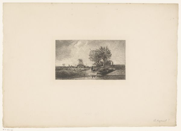 Curator: What an evocative print. We are looking at "River Landscape with Dark Sky" by Wilhelm Wörnl, likely created between 1859 and 1916. It’s an etching, a testament to the artist’s mastery of capturing light and shadow. Editor: It's somber, isn’t it? Almost brooding. The looming sky presses down, and there’s a sense of isolation in that lone river cutting through the landscape. A premonition, maybe? Curator: Absolutely, the mood speaks volumes. Remember, landscapes in this era weren’t merely picturesque. They often served as coded commentaries on the social order, or the relationship between humanity and the divine. Romanticism used nature to reflect inner emotional turmoil, and question societal shifts following the industrial revolution. Editor: Right, so beyond just pretty scenery, the choice of such a darkened sky… I'm curious, what would this landscape have meant to its initial viewers within the cultural milieu of the time? Who did Wörnl intend to speak to, and what dialogues about modernity, gender, and societal role was Wörnl subtly engaging in, if at all? Was this just a technical display of Romantic affect, or a veiled form of protest against rapid change? Curator: That’s precisely the critical lens we need. Prints allowed for wider dissemination, making art more accessible to the middle classes, many unsettled by rapid urbanization. The etching process itself, requiring meticulous work, was seen to be aligned with a renewed appreciation of handicraft amidst rising mechanization. It is as if this melancholic view seeks to mourn something already gone, something forever changed. Editor: And Wörnl's choice of an etching--with that demanding intricacy— positions the piece, potentially, as an artistic assertion that challenges ideas of gendered production... How the work might offer critiques of industrial alienation and prompt considerations about female identity and agency against backdrops of broader socio-economic and cultural changes. It becomes much more than just scenery. Curator: Indeed. It invites us to reconsider art's potential as not just aesthetic object but a conduit for change and social conversation, using romanticism as its aesthetic vernacular. The artist becomes a commentator as well as a craftsman. Editor: Beautifully put. It's easy to get lost in the chiaroscuro, but the true depth comes from the socio-political undercurrents it reflects. Curator: Precisely. I'm always fascinated by the artist's ability to imbed statements, through his command of subject and material.