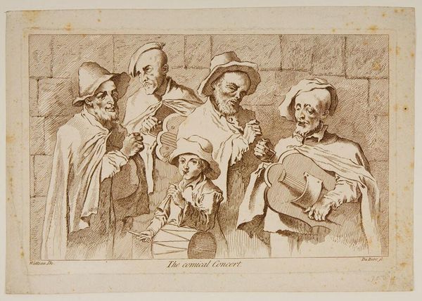 Curator: This sepia print, "Sacrifice," comes to us from Francesco Bartolozzi, an Italian artist active in the late 18th and early 19th centuries. There's an undeniable classical feel, wouldn't you say? Editor: Absolutely, there is a striking formality. Look at the figures—they're deliberately arranged, almost staged. The composition guides the eye directly to the central characters. Curator: Indeed. It's intriguing to consider how prints like this circulated within a society grappling with Enlightenment ideals and shifting religious views. The subject matter would've been quite provocative. Editor: Note Bartolozzi's fluid lines and delicate cross-hatching. The use of negative space creates a sense of etherealness, softening the drama of the scene. Curator: Well, thinking about the broader context, this print underscores the enduring power of religious narratives even amidst secularization. Editor: Perhaps. Though I am most moved by the balance achieved through line and tone alone. Curator: Food for thought. Editor: Indeed.