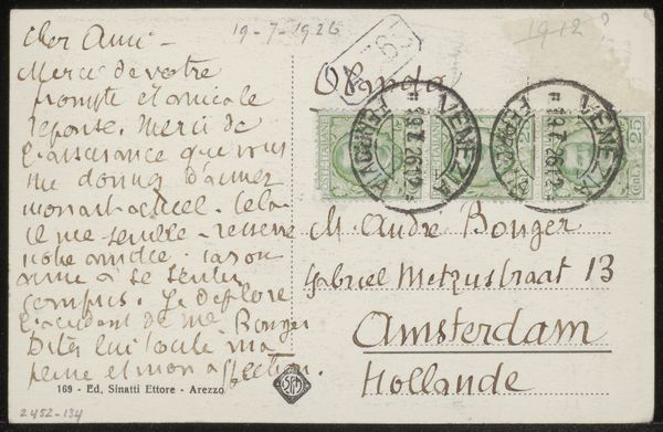 This is a postcard Emile Bernard sent to Andries Bonger in 1908. It’s more than just a quick note; it’s a peek into Bernard's world. The handwriting is fluid, almost like a drawing. See how the ink bleeds into the paper, giving each word a soft edge? The text isn’t just information; it's a physical presence. Bernard layers his thoughts and observations, creating a kind of collage on this small surface. The stamps and postmarks add to the story, marking the passage of time and distance. Even the address is rendered like a sketch. The entire surface is activated, it's a piece of art in its own right! This reminds me a bit of Cy Twombly, whose scribbled, layered surfaces invite a sense of poetry. In this postcard we see the everyday transformed into something expressive and intimate.