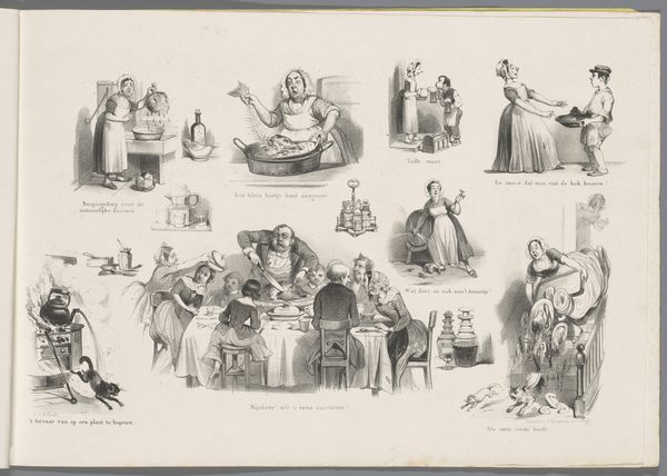 Curator: This ink and pen drawing is titled "Hazardspelers," or "Games of Chance," by Alexander Ver Huell, made sometime between 1846 and 1887. What strikes you first about this collection of sketches? Editor: Well, there is a faintly chaotic feeling. Each scene hints at a separate, fraught narrative, a mini-drama involving these various…gamblers. Curator: Yes, the title offers the overarching theme, and Ver Huell delivers little stories circling it. The image of dice as skulls looming overhead hints at death or mortality as the ultimate risk of wagering everything. Do you think there is a central scene we’re meant to focus on? Editor: It seems, to me, almost like a story board. I see a range of consequences being explored— from quiet desperation in solitude to physical brawls over lost money. Curator: The lone figures at the top and bottom certainly do project distinct emotional states of isolation, of the burden of loss. But you notice as well the way many smaller clusters depict interactions – are they arguing or colluding? Are they sharing in misfortune? Editor: There’s a real moralizing quality too, maybe? A little reminder of the dangers inherent in games of chance and just what a potent symbol these things have been throughout history. In religious art for instance, items and objects within images offer deeper insight to the main subjects. The same approach can be applied here. Ver Huell carefully illustrates what happens when luck, or lack thereof, takes its toll. Curator: Yes, but with such detail! You could lose yourself in one of these miniatures; each suggests an entire social world. What seems most symbolic to you then, with the various symbols here? Editor: The central, spectral figure presiding over everything… a god of fate, perhaps? Clutching his masks? In a game of chance, are we ever really seeing what’s truly in play? Or do we just grasp at shadows and projections of what might be? Curator: What a vivid metaphor! Ver Huell offers us an abundance of intimate moments which taken together, paint a very robust and poignant portrait of humanity’s peculiar relationship with chance, a testament to the highs, lows, wins, and losses we collect during our time. Editor: Ultimately, perhaps it encourages us to think about what other kinds of risks and choices we make, in what becomes a tapestry of everyday occurrences.