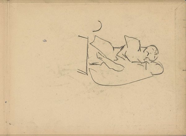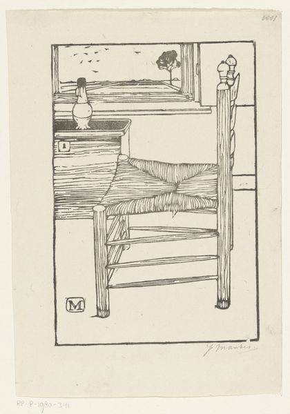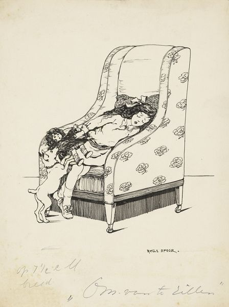 Gerrit Willem Dijsselhof rendered "Kabouter knielend knippend op een tafel" with ink on paper. The scene unfolds with a stark simplicity, defined by thin, deliberate lines against the off-white ground. The eye is immediately drawn to the figure kneeling atop a table, deeply engrossed in the act of cutting paper. Dijsselhof uses line to create a composition that destabilizes conventional perspectives. The figure's posture, combined with the elevated viewpoint, challenges our sense of spatial orientation. Notice how the stool stands awkwardly to the side, as if mocking the figure. The artist plays with scale, compressing space to create a surreal tableau. This manipulation undermines traditional pictorial depth. This work invites us to consider how art can question and rearrange our understanding of reality. The seemingly mundane act of cutting paper becomes a vehicle for exploring themes of perspective, scale, and the subversion of established visual orders.