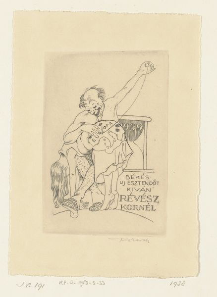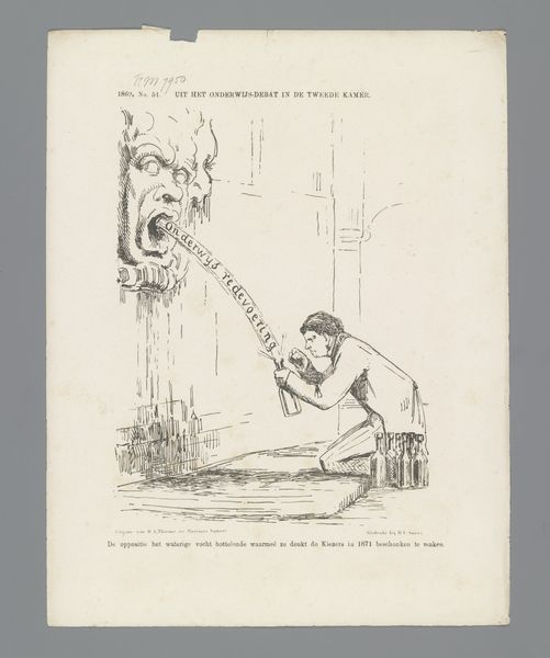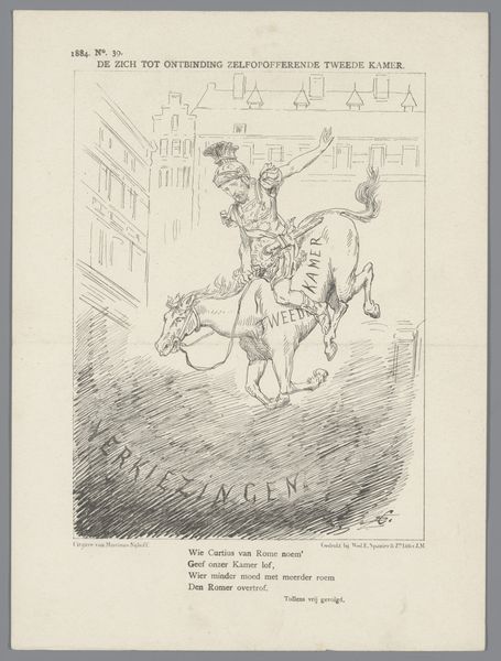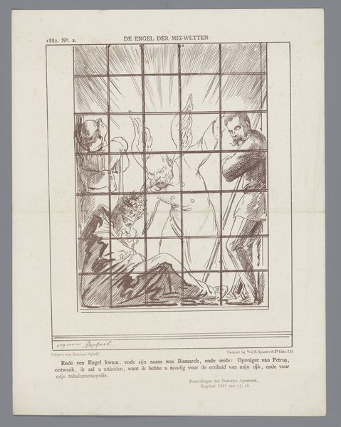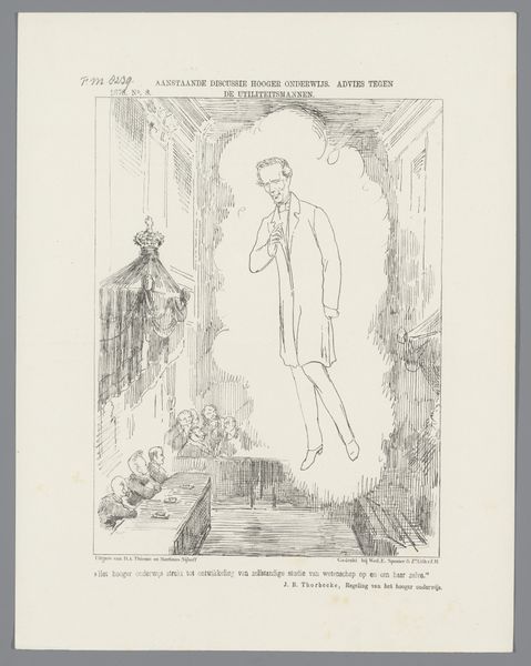 Curator: Here we have a pen and ink drawing titled "Spotprent over de verwachtingen voor 1885" which translates to “Cartoon about the expectations for 1885,” attributed to Johan Michaël Schmidt Crans. Editor: It's immediately striking. The use of line work creates a kind of frantic energy. The girl pulling the banner appears hesitant but also determined against this chaotic background. Curator: Indeed, the density of lines is quite expressive. The artist utilizes graphic art conventions, specifically through printmaking and drawing, to construct not just an image, but a social commentary. This piece was crafted in a time of political reformations and evolving Liberal ideologies. Editor: Looking at it through the lens of social activism, the banner says, "Liberale Unie" which highlights the expectations or rather, the burdens placed on a certain party. It seems to critique the idealism surrounding this new Union through gendered expectation. Curator: Absolutely, but from a material perspective, let's think about the choices. The accessibility of print meant this critique could be widely distributed and consumed by various social classes, creating discussion in public spaces, from the household, or places of commerce. Editor: Yes, the dissemination of images allowed the critiques to quickly influence public perception, and using visual language helped in bridging literacy divides. Even the pen itself can signify authority, questioning its relationship to popular ideas. Curator: The way the lines overlap and obscure suggest uncertainty and struggle. Considering this image and its production, we see it wasn't just about aesthetic presentation, but a vital medium to create cultural perceptions, through readily available supplies. Editor: Which in turn influences future artistic practice and can become a catalyst for activism! I wonder, did women involved in politics feel equally represented by "Liberale Unie," or if they felt like expectations like these were empty words? The cartoon makes you think of how some figures stay cemented in our collective consciousness versus the voices unheard in popular art and in socio-political reforms. Curator: It presents many questions that can engage modern eyes into considering political art as a crafted form of communication that depends upon materiality to disseminate messages for widespread audience perception and discussion. Editor: A great insight into the relationship between artistic creation and socio-political climate. The cartoon offers valuable lessons.