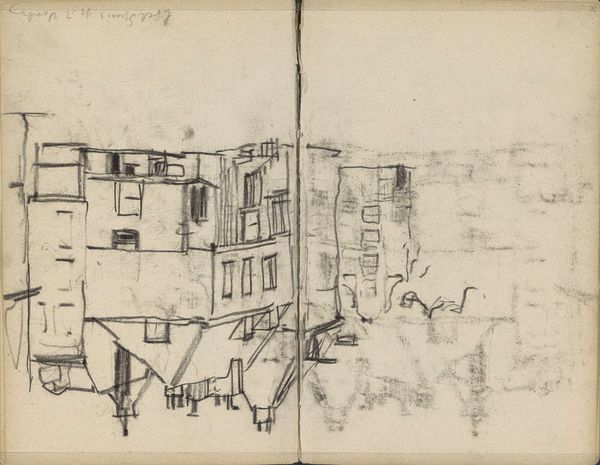 Editor: Here we have George Hendrik Breitner's "Gezicht op het Beurspleintje te Amsterdam," possibly from 1907, a pencil drawing held at the Rijksmuseum. The frantic lines and shifting perspectives create a fragmented feel, almost as if capturing a fleeting memory of the city square. What story do you think Breitner is trying to tell here? Curator: Breitner...ah, he was all about capturing the pulse of Amsterdam, wasn't he? Forget the postcard prettiness; he dove headfirst into the grittiness. This sketch…it's not about meticulous detail, but the energy, the vibe. That Beurspleintje, it was probably bustling, right? The traders shouting, the clatter of trams...He wasn't painting brick for brick; he was capturing a fleeting emotional impression. Think about his photographic work too; he crops unexpectedly, right at the critical instant. So, isn’t it about capturing raw perception, a city not just seen, but felt? Does that quickness speak to you at all? Editor: I hadn’t thought of the link to photography. The sketch-like quality made me focus on the artistic process itself, the artist thinking through the image. Now I see that capturing a "fleeting emotional impression" adds depth. Curator: Exactly. And in a way, Breitner anticipated the pace of modern life; not as clean crisp, and fixed, but fluid, open and unresolved. Perhaps in that way, he has something important to say about our world today, too. Editor: So, he anticipated modernism in this embrace of impermanence, that’s so interesting. It transforms the entire viewing experience. I'm really glad to learn about this. Curator: Me too! There is an element to surprise still waiting to be discovered about even the best known of artists.