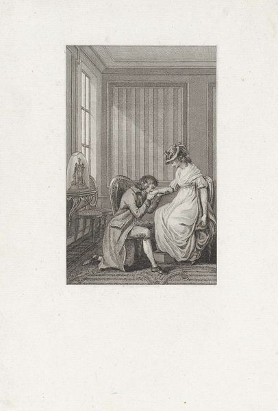 Reinier Vinkeles created this print, "Man in a Monk's Robe Bowing Before a Woman," during a period of significant social and political change, likely in the late 18th century. The image captures a moment of dramatic tension within a domestic interior, highlighting gender dynamics and social hierarchies. We see a woman recoiling in shock or fear, her gesture theatrical, while a monk bows deeply before her. The presence of a mask on the floor and figures in the background adds layers of intrigue and potential commentary on performance, deception, and power. During this time, class distinctions were sharply defined. A religious figure bowing to a woman could be seen as a subversion or questioning of traditional roles. The woman's dramatic gesture, combined with the monk's subservient posture, suggests a narrative of shifting power dynamics. The emotional tension in the scene reflects the era's underlying social anxieties and challenges to established norms. Vinkeles’ print invites us to consider the complexities of gender, status, and the performative aspects of social interaction.