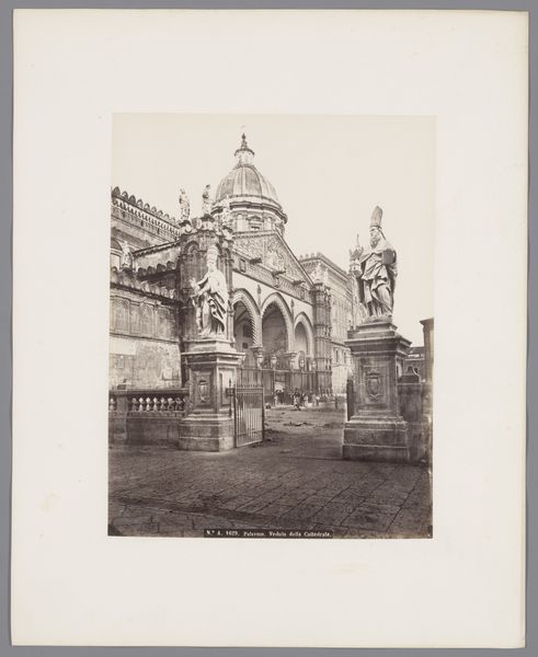 Curator: This photograph, attributed to R. Peli and likely taken between 1870 and 1890, offers us a "View of the Column and Tomb in Piazza San Domenico in Bologna." It’s a gelatin silver print, showcasing a cityscape steeped in Italian Renaissance history. Editor: There's a stark stillness to it, a hushed reverence. The muted colours contribute to a sense of timelessness, as if this piazza exists outside the flow of everyday life. It feels less like a snapshot and more like a carefully constructed stage set. Curator: I agree. Peli's framing directs our attention towards the towering column, topped with a saint. Notice how the photographer employs symmetry, arranging architectural elements on either side. It feels calculated to evoke the grandeur and enduring legacy of the place. What kind of emotional impact does it leave on you? Editor: The photograph makes me consider pillars and columns as assertive declarations of authority and resilience, both secular and sacred. The statue at the top is quite obscured; but its position over the plaza is really what grants it symbolic authority. You get this powerful intersection of religious and civic pride, almost radiating out into the surroundings. Curator: It's fascinating how gelatin silver prints from this period could capture such architectural detail. And the fact that Peli opted for what appears to be toned paper further emphasizes the antiquated and classic feel of Bologna at the time. Editor: Indeed. Plus, the choice to use a monochromatic palette invites reflection upon what has remained over the years—what has become faded with age—versus what continues to rise above. Curator: It’s as though we're given a portal into a different era. One thing is for certain. Peli allows us to peer across history into this grand Bolognese piazza through their photograph. Editor: I am drawn in by what these icons might express regarding a community's identity, desires, and myths about its beginnings—rendered with muted hues, it provides an eerie feeling and perhaps speaks about cultural memory, trauma, or suppressed histories.