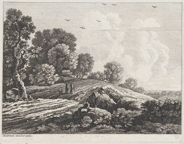 Curator: Here we have "Landscape with a Small Waterfall, in the Foreground a Seated Man and a Walking Woman," an etching dating from sometime between 1690 and 1730. It is currently held here at the SMK, the Statens Museum for Kunst. Editor: Oh, it feels like stepping into a dream. A kind of elegant, sepia-toned daydream. There's this soft focus, almost ethereal quality to it, like looking through a veil. And those figures… are they acting out some myth? Curator: Perhaps not a specific myth, but these pastoral scenes were often allegorical, suggesting moral or historical themes through their idealized settings. The etching as a medium allowed for wider distribution, influencing landscape painting conventions and disseminating particular ideas about nature and its relationship to humankind. Editor: So, it’s more than just a pretty picture. It's selling a whole lifestyle. I can't help but wonder about the two figures in the foreground: are they lovers, or just passers-by in this carefully curated idyll? One seated near the waterfall, and another is strolling with such an oddly round object, seems it should tell an unknown tale. Curator: That's a fascinating point. Their presence infuses a narrative element that would appeal to the viewer and perhaps spark conversations about classicism and naturalism as well as morality within the burgeoning urban centers throughout Europe. The arrangement and the linear qualities speak volumes about the academic training dominant in fine arts circles. Editor: But it's the landscape that truly captivates. That castle in the distance... it has such a dramatic effect. There's such a careful juxtaposition of the rough with the smooth, the wild waterfall versus the orderly structure of the castle. Makes you think about control versus chaos, civilization versus nature. It speaks to all our relationships with things bigger than ourselves. Curator: Absolutely. And it exemplifies a deliberate artistic engagement in socio-political power relations. Landscapes themselves can become political tools, reinforcing prevailing ideologies regarding property, governance, and belonging. This print not only documents the scenery but also participates actively in molding perceptions of space, authority and what defines value systems. Editor: This has offered a way to read an image in much richer depth. Beyond the visual, there’s also social texture… It really gives you something more than just the superficial appeal of what’s there on the surface. Curator: Indeed. This image offers a window into understanding a particular period. It's amazing what a landscape can tell us.