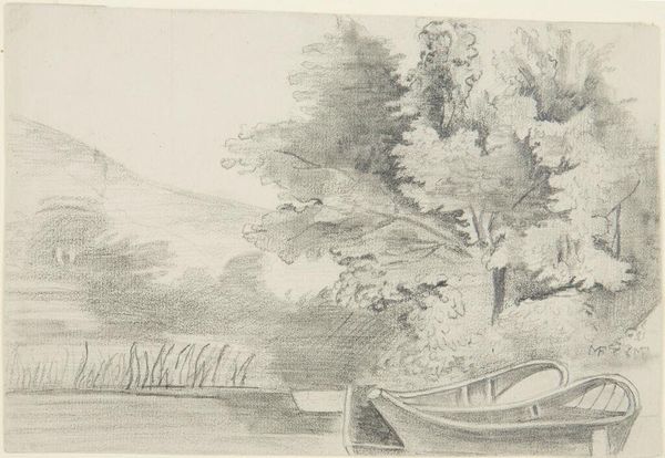 Editor: Here we have John Constable's 1835 pencil drawing, "View on the River Severn at Worcester". It has such a serene, almost wistful quality. The way the boats are rendered, especially those dark curves in the foreground, are so captivating. How do you interpret this work from a formalist perspective? Curator: The initial element that strikes me is the tonal contrast. Observe how Constable manipulates the density of his pencil strokes. The foreground objects, primarily the boats, possess a richness of texture achieved through intense layering, creating depth and substance, while the background is lightly sketched to maximize the viewer's sense of distance. It begs us to look closely at how light and shadow define space. Editor: So, the composition itself creates a sort of narrative? Curator: Precisely. Note, for instance, the delicate rendering of the water's surface contrasted against the heavy foliage on the riverbank. Semiotically, it creates a sense of dichotomy – transient versus permanent, light versus shadow. The rapid, expressive strokes add a dynamic, temporal quality to an otherwise static scene. This effect reflects a careful intention on the part of the artist. Do you perceive any significant structural elements in its construction? Editor: Now that you point it out, the boats seem to serve as anchoring visual weight, pulling the eye into the otherwise spacious scene. It feels like they set up a series of horizontals, with the tree line beyond mirroring their direction, creating visual consonance and a sense of unity despite the apparent contrast in detail. Curator: A very perceptive observation. This orchestrated arrangement encourages an active mode of spectatorship, rather than mere passive consumption of the imagery, urging the spectator to actively interpret meaning based upon structural properties of the artifact. It is in the formal qualities that its unique expression lies. Editor: I've definitely learned a lot about seeing beyond the surface! Thanks for sharing. Curator: My pleasure. Looking at its material components brings new revelations.