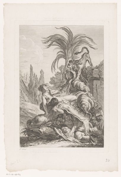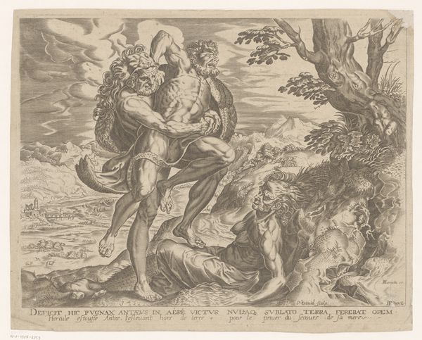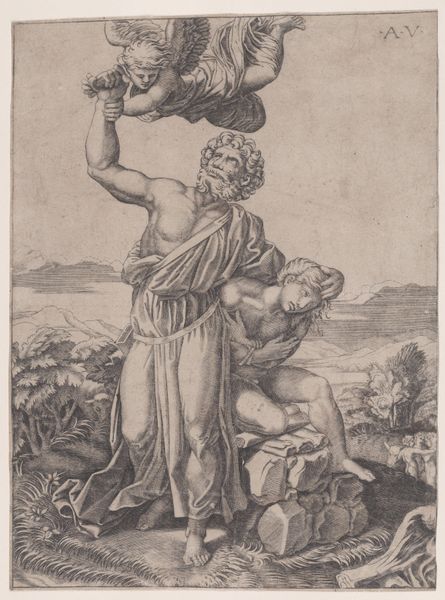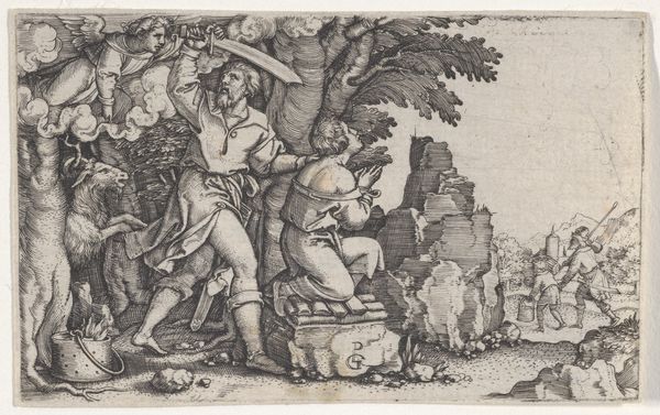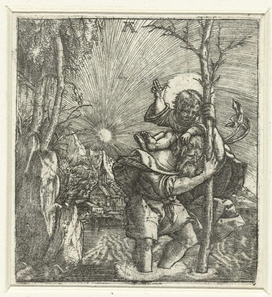 Editor: Here we have Albrecht Altdorfer’s “Saint Christopher Carrying the Christ Child,” an engraving dating from about 1500 to 1538. The detail is amazing, given its small scale, and there's a really dynamic contrast between light and shadow. How do you approach an image like this? Curator: Precisely. We might consider the linear precision that defines the composition. Note how Altdorfer orchestrates light not just as illumination, but as a compositional element itself, emerging dynamically from the upper-left quadrant. Notice how the landscape is meticulously rendered, drawing the eye towards the implied vanishing point? Editor: Yes, the landscape behind St. Christopher almost overpowers the figures, drawing attention away from the main subject. Curator: I propose that this emphasizes the setting's importance as a space where the divine and the earthly meet. Consider the placement of St. Christopher relative to that bursting light source. In his placement, can we perceive symbolic importance relating to illumination, physically and spiritually? How is your attention directed around this image? Editor: The Christ Child almost seems like a miniature adult, with an arm raised in what seems like a blessing. How does that detail contribute to the overall work? Curator: It's not merely representation, it is symbolic. That gesture could be interpreted as a foreshadowing, setting in motion, through his incarnation, the narrative of salvation. But what of St. Christopher himself? Look at the engraving quality of the robes: is there more value ascribed to those details over other areas? Editor: Interesting. It really makes me appreciate the layers of detail in what I initially perceived as a simple, almost humble, print. Curator: Indeed. The power lies not only in the narrative, but how line, form and texture orchestrate your reading of the work, don't you think?