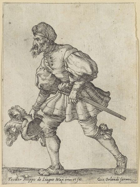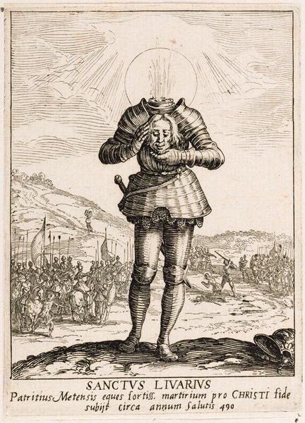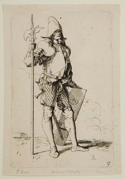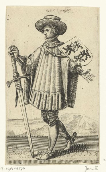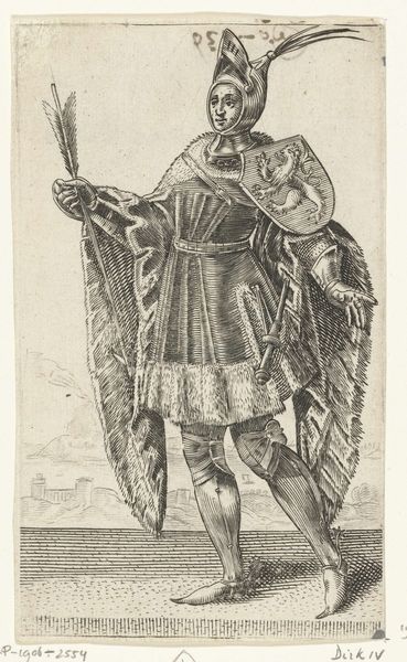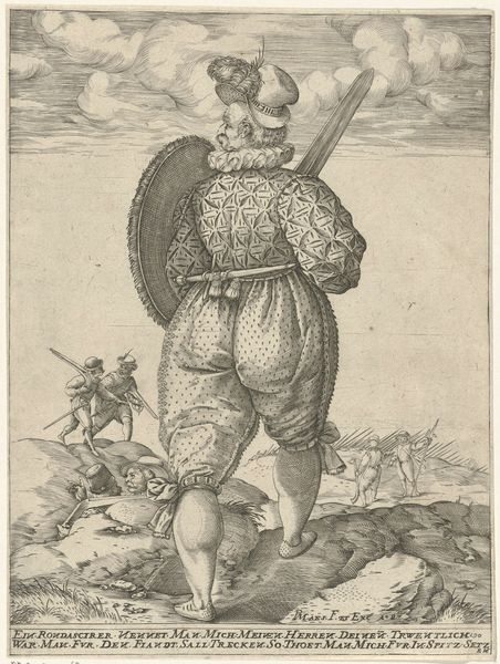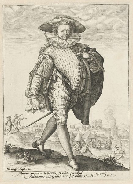Curator: This engraving, "Legeraanvoerder met lans voor een belegerde stad" from 1590, by Bartholomeus Willemsz. Dolendo, caught my eye in the Rijksmuseum's collection. There's almost a surreal quality to it, how the leader looms so large over the landscape. What do you make of it? Editor: It's definitely striking! The contrast between the detailed figure and the rather simple rendering of the landscape creates a real sense of scale. The figure seems to be printed almost like a poster or commodity of some kind... the leader is centered but the material process for sharing images has an effect here. What's your perspective on how the piece might reflect the socio-economic context of its creation? Curator: Exactly! It’s vital to consider how printmaking shifted art from singular objects to reproducible commodities. This engraving would have been made through laborious processes of cutting into a metal plate, a significant investment. The circulation of these prints played a key role in shaping perceptions of leadership and power, perhaps even fueled emerging national identities. What does the leader’s attire say to you? Editor: His attire suggests wealth and authority but looks impractical for actual combat, highlighting more symbolic power than actual war expertise, given that he is in a position above and overlooking those actively warring! Curator: Precisely. Notice the texture rendered in his sleeves and the delicate ruff – all crafted through skilled labor. How does focusing on the materiality, the labour behind the work, change your reading? Editor: Thinking about it as a commodity that could circulate changes everything. The process isn't just about aesthetics; it's tied to economic power and control over image dissemination and also in spreading an ideal. I had focused mainly on the look of the leader himself initially. Curator: Seeing art through a materialist lens like this brings valuable nuance, I think. We see this piece not only as representation but also evidence of the culture industry being built. Editor: Yes, and understanding the printing process opens up insights into both artistic technique and the larger historical and economic context that produced it. It reveals the means behind manufacturing fame.