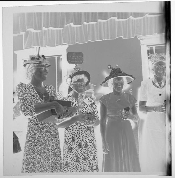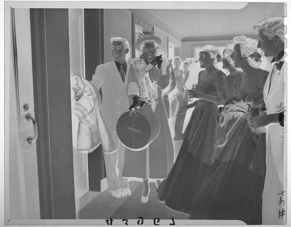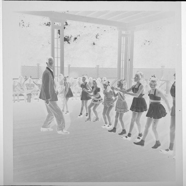 Editor: This is an Untitled photograph by Jack Gould, depicting a graduation scene. It’s interesting how the girls on stage are the focal point, but their backs are to us. What do you make of that? Curator: The averted gaze is powerful. It places the viewer in the position of the audience, those seated. This creates a sense of shared experience, almost voyeuristic. The clock on the wall, the formality of dress, these are visual cues that speak to ritual, societal expectation, and the passage of time. What do these symbols evoke for you? Editor: I guess a sense of anticipation, but also maybe a bit of melancholy? Curator: Precisely. The image becomes a mirror, reflecting our own memories and understanding of such events. It reminds us that these moments are both personal and universal. Editor: So, it’s more about what the image represents than what it literally shows. Curator: Exactly. The symbols elevate it beyond a simple snapshot, inviting us to contemplate larger themes.