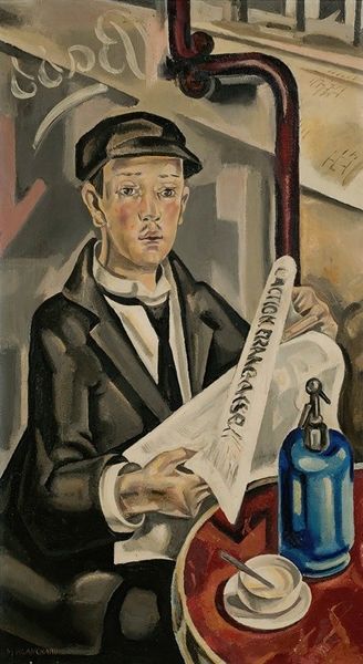 María Blanchard made this painting, called El Borracho, with oil on canvas. Look at the brushwork: there are so many visible marks, and it feels like we're right there in the process, watching the image come into being. I am drawn to the way Blanchard models the figure's vest with chunky, rhythmic strokes. It's like she's carving the form out of paint, building up layers of texture and color. Notice the way the stripes warp and bend, creating a sense of movement and depth. She uses a limited palette of ochres, blues, and whites to create this earthy scene. The colors feel muted and sober, matching the mood of the subject. This piece makes me think of how an artist’s mark-making can be a kind of language, speaking to us beyond representation. It also brings to mind the work of artists like Paula Modersohn-Becker, who similarly used bold, expressive brushwork to depict scenes of everyday life.
