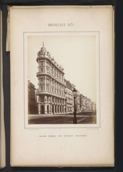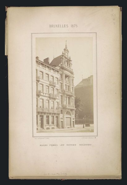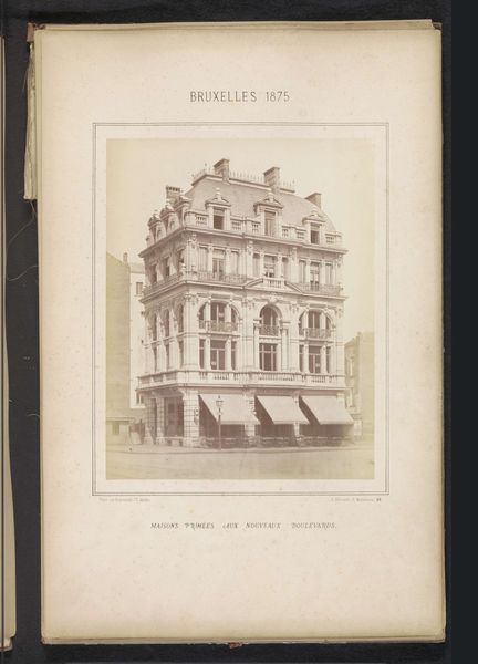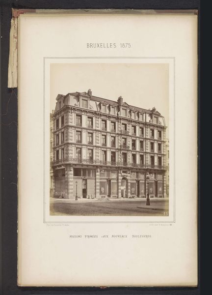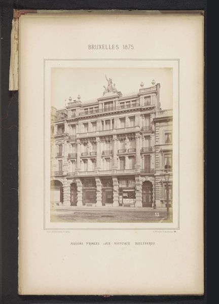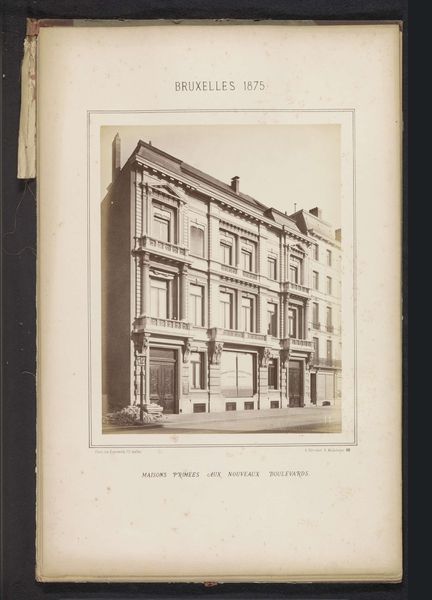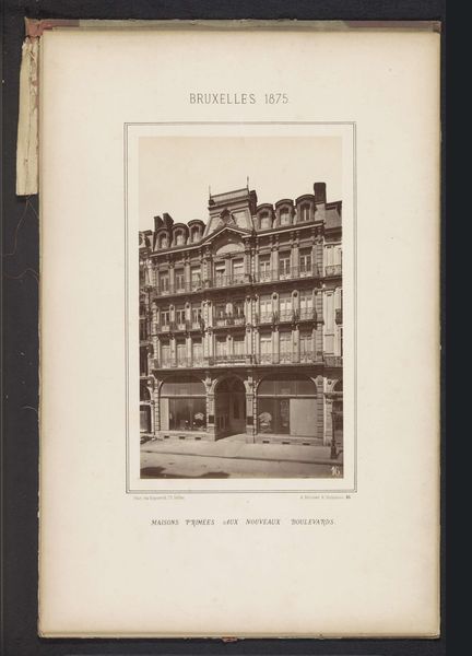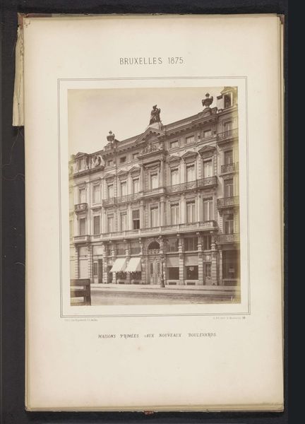 Curator: What strikes me immediately is the stark verticality and rigid geometry captured in this albumen print. The artist, Alexandre de Blochouse, in 1875, presents "Exterieur van het Maison Thonet aan de Boulevard du Nord te Brussel"—the exterior of the Thonet House. Editor: The Neoclassical structure commands such a stoic, almost austere presence. Despite its clear architectural ornamentation, its essence feels oddly muted, rendered even more so in this sepia tone. It's like a frozen moment, devoid of palpable life. Curator: Indeed. Blochouse’s manipulation of light accentuates the inherent structure. Observe the carefully plotted progression of shadows which articulate the façade—notice, too, the strong contrast in value. These elements work in harmony to convey stability and perhaps a hint of the grand urban designs prevalent at the time. Editor: I see the ordered facade but the photographic medium brings an empirical quality too. There are traces of life around the street-level shops, like the awning detail and printed storefront signs, all indicating the modern urban growth Brussels was undergoing during the late 19th century. These suggest the context which propelled a boom in commerce at this moment in the city’s history. Curator: Quite right, each balcony, pilaster, and window pane functions as an individual component meticulously organized within a rigid compositional system, demonstrating Neoclassical architectural sensibilities. But the image’s structure reaches beyond pure aesthetics—it invokes larger themes, like modern ideas around living in and ordering civic space. Editor: True, consider this piece as more than mere depiction; it epitomizes photography's emergent role. Mass production coupled with accessible art—it’s all entwined. Blochouse delivers far more than architectural record. It speaks to rapid commercial and civic transformations underway then, a point easily dismissed by purely formal analyses. Curator: So in appreciating it as an objet d’art and cultural artifact, each interpretation unveils distinctive facets which together weave this singular encounter. Editor: And understanding that interaction enriches how one views even something that first impressions call plain. It’s a lesson applicable outside gallery settings also, of course.