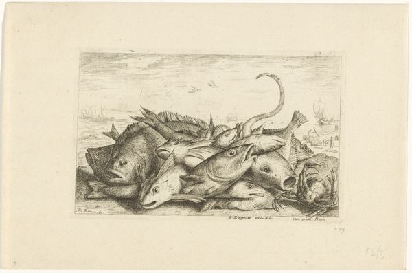 Curator: Eugène Van Hove's etching, "Two Lions Fighting Over an Antelope," likely completed between 1879 and 1910, presents a rather striking image of primal conflict. Editor: It's immediately brutal, isn't it? The raw tension conveyed through the dynamic composition of the lions and the limp form of the antelope creates an unsettling tableau. The stark contrast in light emphasizes the violence of the scene. Curator: The landscape surrounding the lions serves as a crucial structural element. The texture created by short, repetitive strokes builds into foreground and background planes of contrasting value which intensify the fight. See how the density of etching in the animals creates a focal point amidst the flat plain of the ground and sky? Editor: Lions fighting each other around an antelope carcass isn't novel. It signifies the conflict for resources, the natural selection processes, which are deeply rooted in symbolic systems. We instinctively associate these symbols of death and destruction with an almost Darwinian outlook on natural order. Curator: But, while the subject itself is conventional, consider Van Hove’s execution. The intricate network of lines – particularly within the manes of the lions and along the body of the antelope – imbues the image with an intense textural presence. They build formal volume through a subtle layering of tone. Editor: Yes, and the image also captures an interesting blend of raw animality and...something almost aristocratic in the stance of the lion atop the prey. It's as though a lord has bested an enemy for spoils. Curator: Ultimately, Van Hove’s attention to the pure rendering of forms and the formal composition of the animals elevates this simple etching beyond a basic genre painting. It becomes a very compelling meditation on texture, balance, and tension. Editor: It speaks to enduring concepts of competition and mortality, reflecting the perennial dance of survival, doesn't it? Even now, these same archetypes repeat around us, reminding us of this primal narrative in unexpected places.