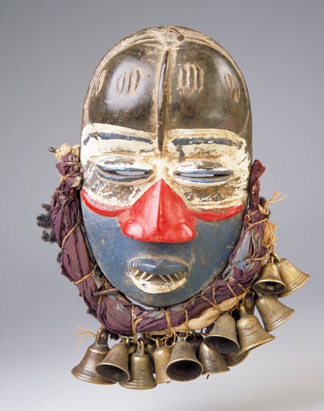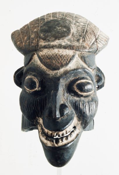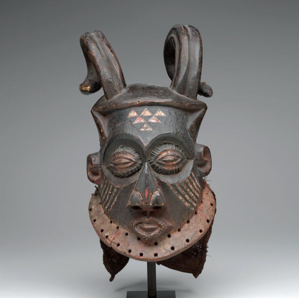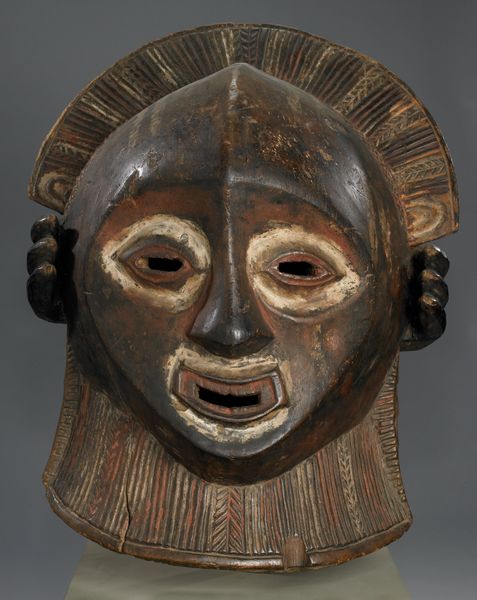 This helmet mask is part of a lineage mask group, or a family of masks that perform together. It represents the male human face and symbolizes a royal or clan ancestor. Masks such as these usually perform at funeral or memorial celebrations. This mask is worn on the top of the head, while a mesh veil conceals the performer's face.