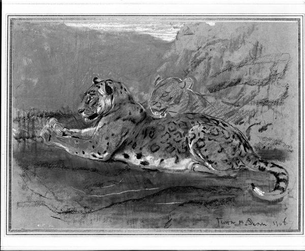 Editor: Here we have Antoine Louis Barye's "Two Jaguars in Their Lair," a small watercolor piece. The textures are quite captivating. What strikes you about its formal qualities? Curator: The composition is dominated by the contrast between light and shadow, highlighting the muscular forms of the jaguars. Note how the artist meticulously renders the coat patterns, emphasizing their organic yet structured design. Editor: I see what you mean about the patterns. It's like the spots create a rhythm across their bodies. Did Barye intend to capture the essence of raw power? Curator: Perhaps. Consider the interplay of line and volume. The sinuous curves of the resting jaguar juxtapose with the alert posture of the standing one, creating a visual tension. Form triumphs subject here. Editor: So, the formal elements overshadow the narrative? Interesting. Curator: Precisely. The focus remains on how Barye manipulates form and light to generate visual impact, not on telling a story about the animals. Editor: That really changes how I see it. I'll definitely be looking for that in other works. Curator: Indeed. This piece offers a valuable lesson in appreciating the intrinsic qualities of art.