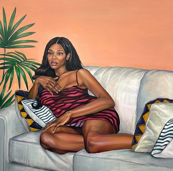 Lanise Howard made this painting, "Procession; the act of Guiding" with an airbrush, I think. Look at those seamlessly blended colors. It’s like witnessing a slow, graceful dance of pigment across the surface. You see a lot of labor, I mean love, in the smooth gradients of the sky, as it shifts from blue to peach, a dreamy backdrop that feels both expansive and intimate. There’s this hand, see, that rests on the subject’s shoulder. It’s almost ghostly, in that the edges are so soft. It looks like a form emerging from a mist. I love how it contrasts with the clean, sharp lines of the lotus leaves. That hand is a gentle suggestion, a guiding presence, a reminder of connection and support. This piece reminds me of Njideka Akunyili Crosby’s work, where personal stories and cultural histories meld into one. Howard is also part of that conversation, weaving narratives of identity, guidance, and quiet strength.