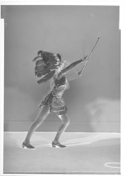 Curator: This striking photograph, currently held in the Harvard Art Museums, is titled "Untitled (drum majorette, right leg raised to side)" by John Deusing. Editor: The first thing that strikes me is the dynamism frozen in the negative space. It's all angular energy. Curator: Considering that the image is undated and Deusing's life dates are unknown, we might look to the cultural context of drum majorettes. Their rise coincided with the popularization of marching bands and spectacles of nationalistic pride. Editor: The composition itself feels like a study in contrasts. The severity of the pose against the airy, almost ethereal lighting. And consider the hat, perched so deliberately, a focal point drawing the eye upwards. Curator: Absolutely. Thinking about this image in relationship to gender roles, it evokes the complex performance of femininity on public display. Editor: It is a compelling photograph. The geometry of the pose really locks the viewer in. Curator: Indeed, it invites us to consider the interplay between individual expression and cultural expectations.