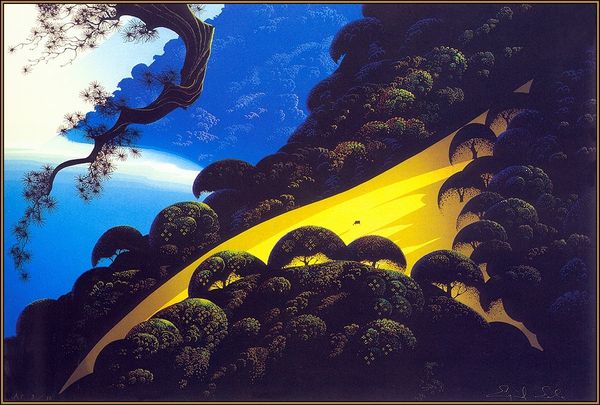 Curator: I am utterly spellbound. The colours, the minute detail...It’s like fairyland but more than a little disturbing too. Editor: Indeed, "Mystic Mountain," an acrylic painting dating back to 1989 by Eyvind Earle, is quite remarkable. We observe meticulously rendered organic forms shaped into seemingly artificial shapes. It’s very stylised, what do you make of that choice? Curator: It tickles my imagination! The shapes of the bushes are perfect globes, not a stray leaf in sight; then that tree bough snaking its way across the top... It’s both incredibly comforting, somehow familiar, and deeply unsettling, too precise. Almost surreal, I’d say! Editor: Precisely, the geometric arrangements in a natural landscape give rise to a structured interpretation. Think about the layering of colors as a strategy—a visual language. What story do these sharp delineations and intense hues tell? Curator: I wonder... is it a haven, or perhaps a hyper-controlled territory where nature is being meticulously, if lovingly, observed and trimmed into order. I wonder where it is exactly. Does this world really exist, or does he dream it into existence, maybe with acrylic paint as a medium and language of emotions? Editor: Fascinating. Note the distinct patterns, repeating with almost mathematical precision. This points to a Modernist aesthetic, and contrasts with more organic, random styles often found in traditional landscape painting. Earle seems to suggest a deep structure beneath nature's apparent chaos. Curator: And perhaps that’s the very real contradiction isn't it! How much is it, can we truly grasp of the mystic beyond its shapes. So much about the work feels romantic and wistful. Maybe it makes us realize the value of beauty and what is concealed within our nature as observers, thinkers and viewers. Editor: So as you step away, reflect on "Mystic Mountain" – not merely as a scene, but a visual philosophy; how nature can be ordered, but mystery forever evades, and ultimately defines us all.