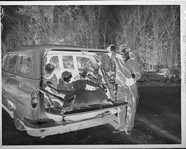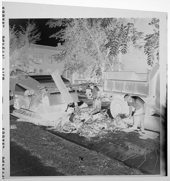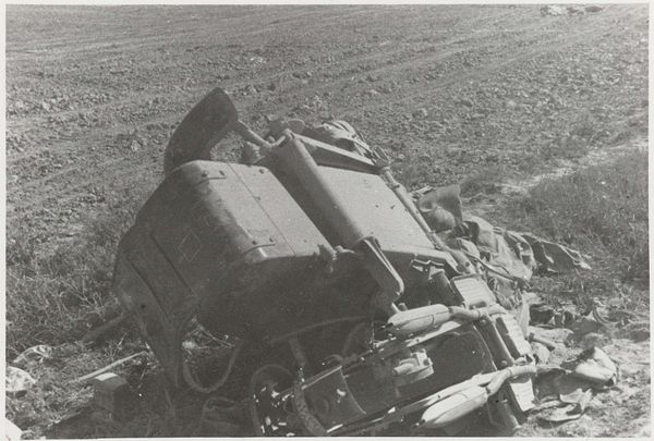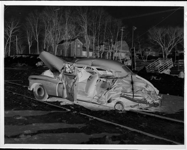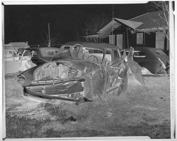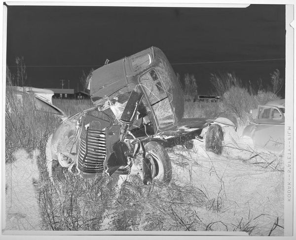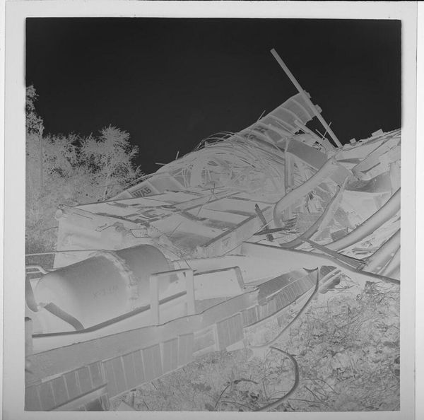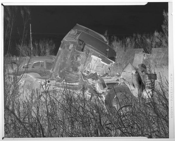 Curator: Well, this is Harry Annas' "Untitled (wrecked car)" from the Harvard Art Museums. It's a photographic negative, just 4 by 5 inches. Editor: It's startling, almost ghostly! The mangled car dominates, surrounded by a graveyard of metal. There is a certain beauty to it, ironically. Curator: Indeed. The negative process gives it an eerie quality, highlighting the violence done to this machine. It feels very detached, clinical even. Perhaps an artifact of 20th-century car culture, and its casualties? Editor: The high contrast makes the wreckage pop, and the field of cars behind it seem to stretch into infinity. Is it a statement on waste, or a morbid fascination with destruction? Curator: Perhaps it's both. Annas captures a very specific moment in our relationship with technology and risk. It is the spectacle of disaster, carefully composed. Editor: It has certainly made me think about the human cost that is invisibly woven into our love of the automobile. Grim, but thought-provoking. Curator: Absolutely, art allows us to reflect on these deeper issues.