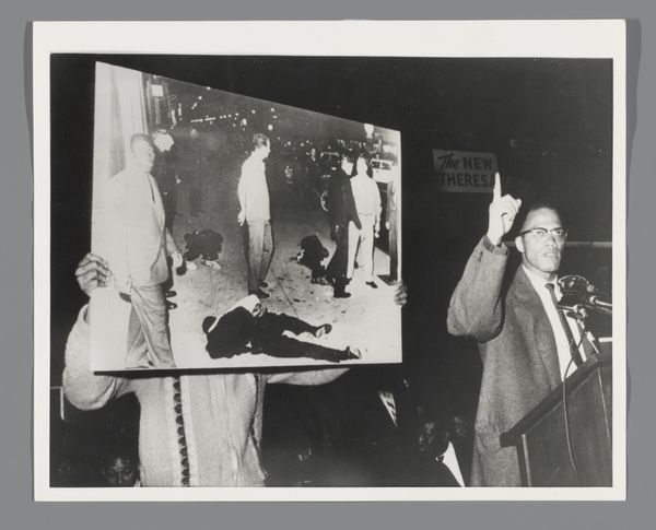Curator: Oh, the sweet smell of champagne and anticipation! Look at this slice of Parisian nightlife from 1948, captured by the Keystone Press Agency. It's titled "Maurice Chevalier opent cafe-chantant, Montmartre." Editor: It’s funny how history becomes like an old, beloved photo album, slightly sepia-toned in our memories, regardless of the actual image! This feels exactly like that. A very public moment caught candidly—I get a rush of joie de vivre, like you're about to hear secrets whispered from a bygone era. Curator: Absolutely! Chevalier is the man wielding the bottle as if it’s a magic wand. To me, champagne has always symbolized transformative moments; an alchemical brew as old as theatre and, often, just as dramatic. This photo captures a threshold moment for this new space. Editor: And see how he’s opening it not with a gentle twist but what looks like a saber?! That aggressive flourish reminds me of certain figures cutting through the old world on the rise. Curator: He knows how to make a grand entrance! Also note how the people around him have mixed reactions—amusement, expectation, pride… each a small story within the bigger one. This array captures the mix of emotions and energies that opening night in a public setting would certainly trigger. Editor: Exactly! It's a study in public emotions, framed against what I'm guessing is the café's promotional signage: faded posters, bold lettering. What I appreciate most is the child holding the microphone. What could this represent in terms of popular culture, media, entertainment... It’s such an intriguing symbolic layer here, juxtaposed with that celebratory champagne burst. Curator: The future of entertainment itself, being handed the mic? Beautifully stated. You are right, this gesture does signal transition but also the cyclical nature of performance and memory. This photograph leaves you with more questions than answers. It’s quite charming. Editor: Definitely food for thought about entertainment then and now, its ritual and icons. A lovely artifact and the more you analyze it, the more that the image blossoms.