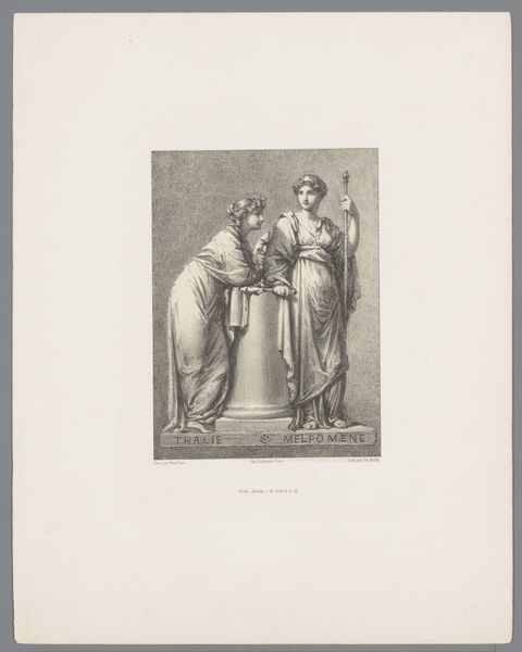 Curator: This rather charming print is entitled "Clio en Urania," created around 1851 by Julien-Léopold Boilly. I'm struck immediately by how ethereal the two figures look on this pale toned paper. Editor: Yes, it does have a delicate, almost neoclassical feel. What resonates with me is how Boilly, a well-known genre painter, turns to these allegorical figures. He is known for scenes of everyday Parisian life, so seeing him depict the Muses feels… deliberate. Why Clio and Urania, I wonder? Curator: Perhaps it speaks to his aspirations beyond the everyday. Clio, muse of history, and Urania, muse of astronomy – it is a pairing which elevates the subject beyond fleeting moments. In this context, the aged paper becomes almost a historical artifact in itself, giving visual and tactile dimension to Clio's historical significance. Editor: Indeed. Consider how academies in the mid-19th century were establishing hierarchies of art. Genre painting, while popular, was seen as "lesser" than history painting. This image could be read as Boilly trying to engage with and legitimize history, perhaps staking a claim for a more elevated status. Note the prominent globe – a potent symbol, it would be worth considering where and how the artwork was shown. Was it to participate in any particular scientific or cultural discussion of its time? Curator: And doesn’t that globe symbolize, too, the ambition of historical narratives themselves? It offers this invitation into worldviews, from one era to another. The light colors soften this ambition slightly – but those details of clothing, the facial expressions… these still connect directly across time. It has echoes of a Roman fresco. Editor: Exactly! Even though printed, the detail evokes monumentality. It serves almost as a record of knowledge and authority as established and understood then. It reminds us that what seems "classical" now was once a contemporary mode of expression shaped by institutional ambitions and socio-political climate. Curator: I suppose that’s why I find this dialogue of two muses so compelling. On the surface it's a tribute to classical ideals, but beneath, it murmurs of artistry navigating its own era. Editor: Yes, an artwork reflecting upon history whilst simultaneously becoming a part of it. That’s what really sticks with me now.