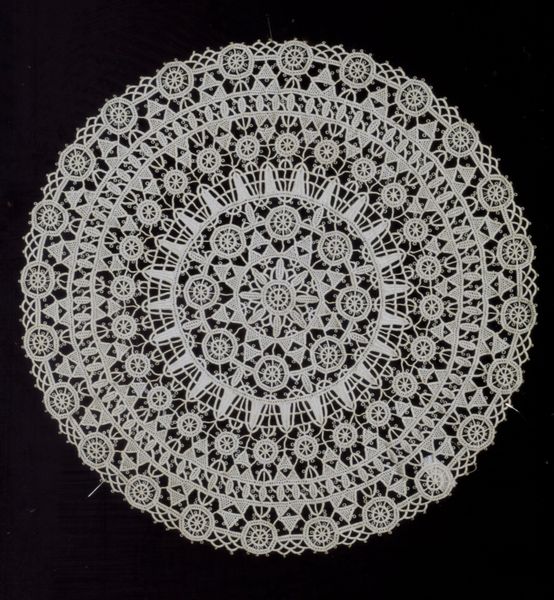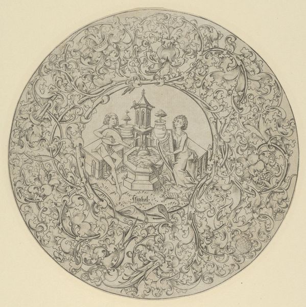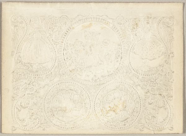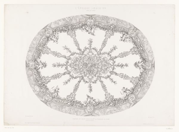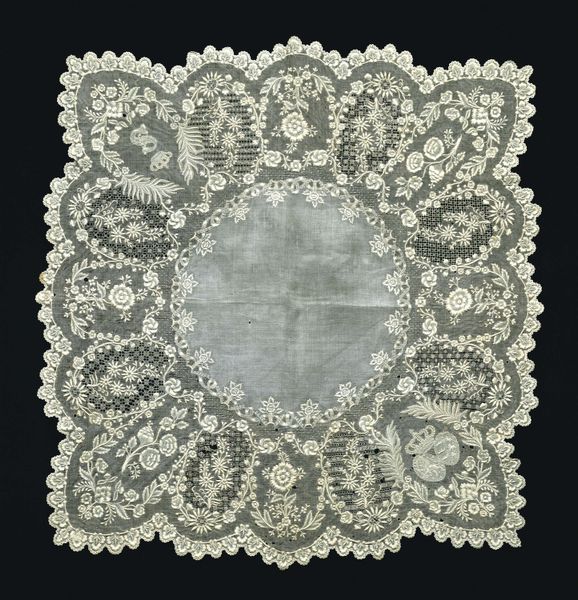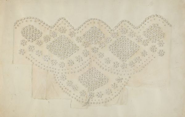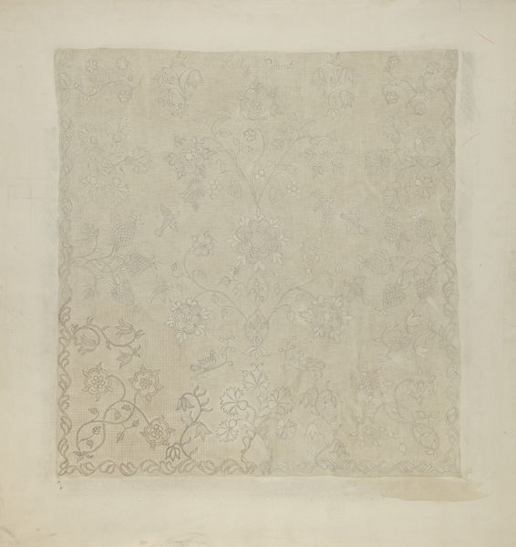 Curator: I find myself drawn to the delicacy of this piece, an etching titled "Bedspread," created around 1936 by Irene Schaefer. It's incredibly detailed. Editor: Intricate. Almost overwhelmingly so. My immediate sense is of intense labor. The texture creates a hushed, almost reverential mood. Curator: Etchings such as this offered patterns for domestic craft, a way to introduce bespoke elements into the home during the interwar years. It echoes traditions of handcraft even as industrial printing gained traction. Editor: And look at the density of the pattern itself. The basket of flowers motif seems fairly traditional, but the repetition and layering create a sort of optical vibration. I find that really striking, the way the image almost destabilizes. Curator: Absolutely. The floral patterns, the circular format...these are deeply resonant with folk traditions associated with the home. Floral motifs have long been connected with femininity and domesticity. Do you think there is also an aspiration beyond mere replication implied, as craft gives way to mass production? Editor: Perhaps. The organic pattern fights against its own geometry, becoming something more abstract than simply "decorative." It’s as though it anticipates future developments in textile design, bridging a domestic tradition and modern design principles. Curator: Thinking about those organic patterns in conjunction with the mechanical processes used to produce the etching brings in interesting considerations of technology, the changing roles within domestic life, and female authorship in design at this period. Editor: It really underscores how even seemingly simple domestic designs can embody so many layers of artistic and cultural intention. It rewards slow looking. Curator: Indeed. Hopefully listeners will be intrigued enough to spend further time exploring such fascinating intricacies. Editor: Definitely. Each layer peels back to reveal further complex nuances of construction.