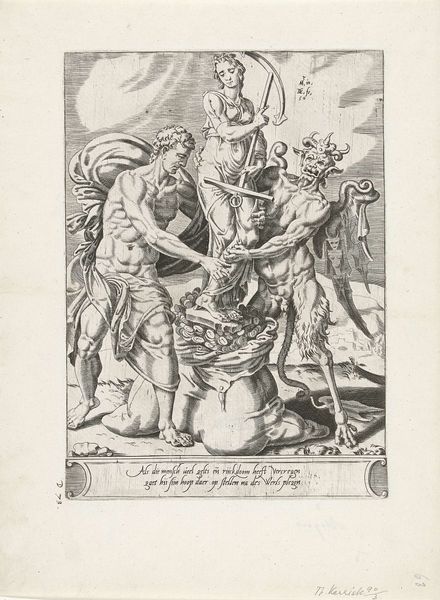 Curator: We're looking at a 1556 engraving by Dirck Volckertsz Coornhert called "Dwaasheid van drankzucht," which translates to "The Folly of Drunkenness," currently residing at the Rijksmuseum. My first thought? It's chaotic! So much activity, and all in these intricate lines. Editor: It is intensely busy, isn't it? Almost like a fever dream visualized. And immediately striking is the composition; the way it visualizes power structures through its chaotic and somewhat menacing energy. The central figure hoisting a cage is... well, unsettling. Curator: He does have this desperate, almost crazed look, doesn’t he? And notice what's in the cage— it looks like figures revelling in their drunken states, and the man in control seemingly fuelled by it? The symbolism seems pretty on the nose here, playing into typical narratives and attitudes of its time. Editor: Precisely. That the drunken subjects are confined in the cage emphasizes the loss of agency when controlled by addiction. What is particularly striking is the inscription on the print - especially the phrase ‘how long shall fools delight in things which will be harmful’ which underscores a very grim moralizing lens typical of Dutch Golden age art. It places drunkenness not merely as pleasure seeking but one that is damaging. The work makes you confront broader questions about social control. Curator: Absolutely, that moral weight hangs heavy in the print’s atmosphere, especially through all those sharp lines used in the etching, giving the piece an urgency and an overall tense feeling. And there is some gallows humor, if you ask me - just looking at the faces in the crowd and those being suspended above with their little cups... it's like a darkly comical performance. Editor: Comical, perhaps, if one overlooks the societal condemnation dripping from every detail. But is that perhaps also part of its genius? It acknowledges pleasure even as it chastises the mode through which it is attained. The composition cleverly frames the scene against ruined architecture and stormy skies, almost alluding to an apocalyptic downfall - and it seems that we're left to question what role our indulgences will play in that scenario. Curator: It all coalesces into a haunting image - quite memorable despite the relatively limited tonal range of engravings. I suppose "memorable" is an understatement: I certainly won’t forget about the grimacing guy any time soon! Editor: An important commentary on societal failings; in this print Coornhert does what any true artist of their time would: offer social critique with the dark tones necessary to reflect such fraught circumstances.