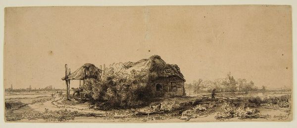 Curator: Ferdinand Kobell's etching, "Mule-driver by a Mill," presents a pastoral scene. It's a study in contrasts between the textures of nature and man-made structures. Editor: It feels like a dream I once had, full of quiet industry and rural simplicity. See how the light almost vibrates in the water? Curator: Notice how Kobell uses varied line weights to create depth and texture—the dense foliage versus the more delicate sky. The composition directs the eye from the mill to the distant church spire. Editor: To me, there's a gentle melancholy here. Maybe it’s the lone traveler with his mules, or perhaps it's just the timeless quality of a landscape that feels both familiar and remote. Curator: Indeed, Kobell masterfully captures a serene moment, inviting contemplation on nature's enduring presence. Editor: It’s a glimpse into another world, rendered with such exquisite detail that it stays with you long after you've turned away.