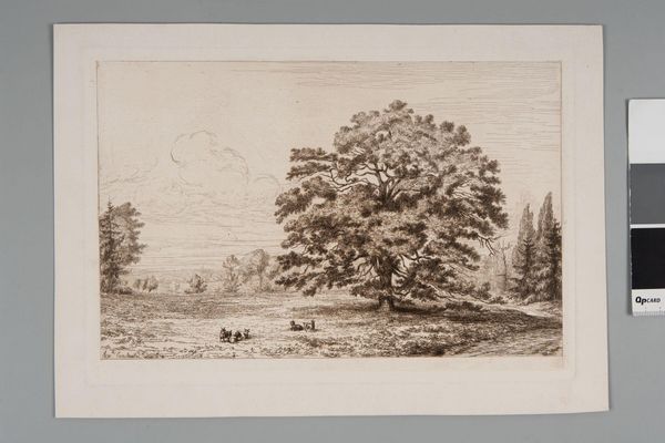 Curator: Take a moment to observe "Landschap met bomen en een toren" – a work by Lambertus Lingeman created sometime between 1839 and 1894, rendered with watercolor and colored pencil. Editor: My first impression is of a quiet, contemplative scene. The muted tones create a serene atmosphere, almost melancholic. It feels quite intimate, doesn’t it? Curator: It does. Given its probable dating in the Romantic period, we can assume that Lingeman carefully chose his materials, emphasizing accessible and portable ones to record an individualized vision of the landscape in rapid sketches and watercolors. This could reflect rising trends of amateur artmaking within expanding markets and urban centers. Editor: Interesting point. The materiality of watercolor, for instance, lends itself well to portraying ephemeral light and atmospheric conditions that were so crucial for romantic landscape painting. The tower and the rustic fence are intriguing too. Do you think they serve as symbols of the encroaching presence of civilization on an untouched idyll, typical of the era? Curator: It is interesting to observe them and think of the Romantic notion of progress versus nature, certainly. What strikes me, too, is Lingeman's likely position as a mid-level civil servant rather than a wealthy leisure painter, which lends another dimension of labor and socio-economic identity in contrast to elite tastes. How would a painting like this potentially relate to discussions around social identity in the Dutch landscape? Editor: That's a key angle. Considering the time of its making, the rise of bourgeois nationalism, colonialism, and rapid urbanization surely shape how the artwork signifies power relationships between society and the land. We must reflect upon the artist's place and agency to resist or reproduce prevailing sentiments on environment, belonging, and identity during the time. Curator: And yet, at the level of production, one might look at where his artistic materials came from and question whether this very aesthetic project hinges on extracting colonial resources or erasing non-European artistic styles in favor of a supposedly 'universal' view. Editor: I agree that taking that approach enables us to bring to light issues about resource consumption, colonialism, and exploitation, revealing layers beneath its initially serene appearance. This is where a contemporary interpretation enriches our dialogue with art from the past. Curator: Indeed. Lingeman's landscape invites contemplation of our connection to the natural world—in ways the artist probably didn’t realize at the time. Editor: Precisely, which highlights the endless ways we continue engaging artworks from the past to make sense of pressing concerns now.