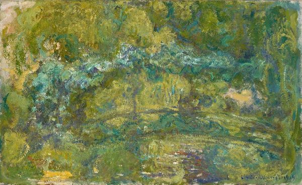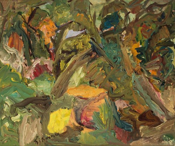 Curator: This is "Road in the Forest," an oil painting created in 1937 by Sasza Blonder. Editor: Oh, wow, it’s like peering through a kaleidoscope filled with leaves. It's more felt than seen, a memory of a forest. I get a sense of swirling color and texture. What was Blonder up to here? Curator: He seems to be investigating the boundaries between representation and abstraction. The materiality of the paint itself is foregrounded. Notice how the brushstrokes become almost more important than the scene they are depicting. It asks us to think about how landscapes are produced, viewed and consumed as images, commodities. Editor: Definitely! It feels less like a tranquil walk and more like a… sensory overload. Those thick impasto strokes almost vibrate. You can almost feel the humidity of the forest air pressing in, right? Was Blonder a big fan of Van Gogh or Soutine? There’s definitely an affinity. Curator: The influence is definitely there, however, there’s more at stake, this painting isn’t about celebrating the beauty of nature in a simplistic manner, but about using landscape painting conventions to point toward the materials and construction behind them. Consider the availability of paint in tubes at that time and what that meant to how artists like Blonder began using that new technology to investigate form and materiality! Editor: Fascinating! The earthy greens and browns combined with unexpected pops of violet and blues are unexpectedly moving! Like discovering hidden depths within a familiar path. The path leads the eye, but it doesn't provide clarity, just…more mystery. It makes me question what I think a "forest" or "road" even are. Curator: Blonder here highlights that what we think as natural is inevitably tied to the tools and industrial processes we have made natural in themselves. Editor: Well, now I'm seeing a factory floor under a guise of an idyllic escape! It gives you a lot to ponder about walking outdoors. It turns it into such a philosophical endeavor. Thank you for untangling this, in the best way! Curator: Of course. Thinking about art and the means and processes to its creation is what makes art relevant.