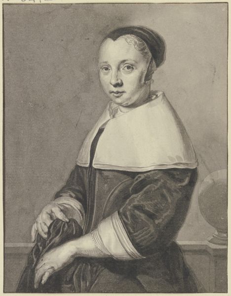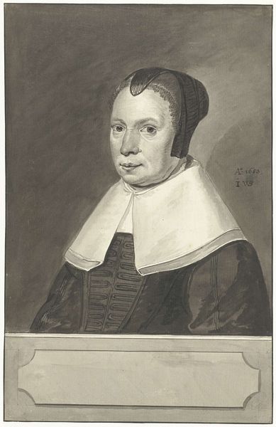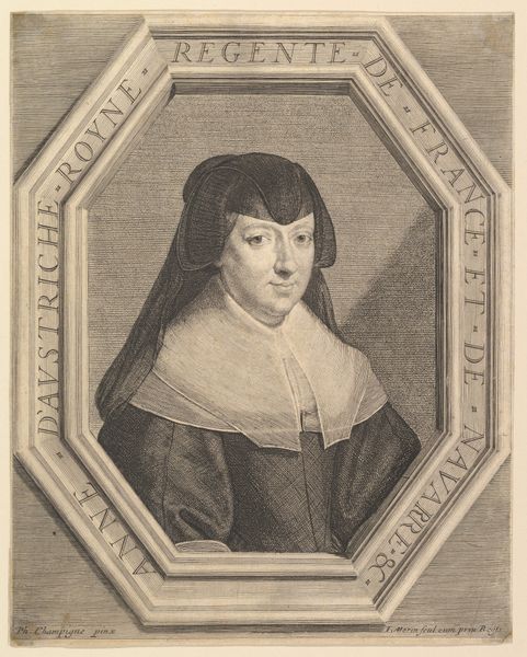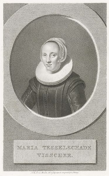 Curator: What a serene expression! I feel drawn in immediately by the quiet dignity. Editor: Indeed. What we have here is an engraving, now held at the Rijksmuseum. It is entitled "Vrouwenportret. Buste in ovaal, een weinig links gewend, met zwart kapje op, een grooten linnen met kant omzoomden kraag om, en met hangers in de ooren," and was created sometime between 1615 and 1676 by Theodor Matham. Quite a title, isn't it? So descriptive! Curator: Absolutely! And Matham really captures the spirit of the Baroque era with its love for detail, especially in that glorious lace collar. The way he renders texture in simple lines is astonishing! It has this beautiful oval frame which I see as the symbolic egg – a powerful archetypal image. Maybe hinting at fertility, family, heritage? What are your thoughts about it? Editor: Hmm, I initially found the composition somewhat...constrained. But the more I look, the more I appreciate her steady gaze – that hint of inner strength amidst all the rigid societal expectations encoded in her attire. What would it have been like for the sitter to engage with Matham, and eventually to see her portrait memorialized in such a permanent manner, is anyone's guess. There is some story hidden somewhere. Curator: Precisely! This portrait provides a looking glass, an image through which we may project questions about female roles during the Dutch Golden Age. How did the rising merchant class impact traditional portraiture? And how did gender shape those very portrayals, subtly or not so subtly, informing our collective memory. This print certainly is very insightful. Editor: It certainly prompts a great many questions about those bygone eras. Makes you think, doesn’t it? Now, back to our time! Shall we proceed?