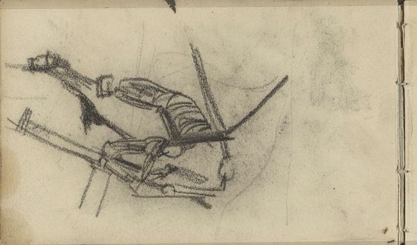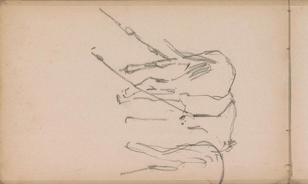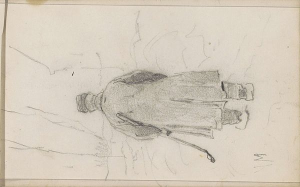 Curator: Up next is "Boerin met een hark" or "Farmer with a Rake", a pencil drawing on toned paper by Johan Antonie de Jonge, thought to be created sometime between 1881 and 1927. Editor: Mmm, stark. It's a landscape with a kind of ghostly quality. You can almost feel the rural silence just looking at it. It looks very drafty; like a forgotten thing hastily drawn on some scrap of paper. Curator: Well, De Jonge’s approach reflects the academic realism valued at the time. We often see these pencil sketches as preliminary studies that capture essential forms and compositions of rural life. Think of it as a quick observation turned artistic endeavor. Editor: Observational, yes, but the soul of this is in that rawness! It’s all about capturing a moment, fleeting light, the turn of the head…you sense the artist's presence as though they were right there beside the field themselves. This also gives it a quality like Millet's art and links back to older Dutch landscape painting and the rise of the common worker in visual imagery. Curator: Indeed, there is a move here to recognize agricultural laborers; De Jonge presents an honest view, possibly challenging urban elitism of his time. This era saw increased migration to cities and the need to address rural decline and the contributions of countryside people to a nation's cultural and economic fabric. Editor: But don’t you find a certain vulnerability? The woman is kind of faceless, not idealized. It makes you consider the hardships maybe. Like they are trying to be solid when society just brushes them aside. That’s really thought-provoking! Curator: Yes! That feeling mirrors the larger cultural discourse about who got to be seen, and who mattered in an industrialized world. How should farmers be visible or have power, right? What value does agricultural work hold in the changing tides of nationhood and progress? Editor: To look at this seemingly humble pencil sketch and see that…that’s quite an invitation to remember the silent contributors around us, and not just then. It’s an always thing. Curator: Exactly! This drawing reminds us that sometimes, the simplest forms carry the deepest cultural resonance. Let's carry this vision to our modern landscape too.