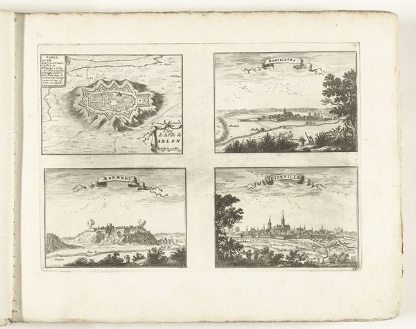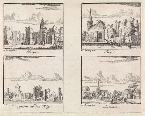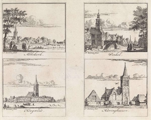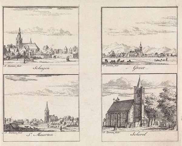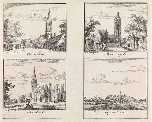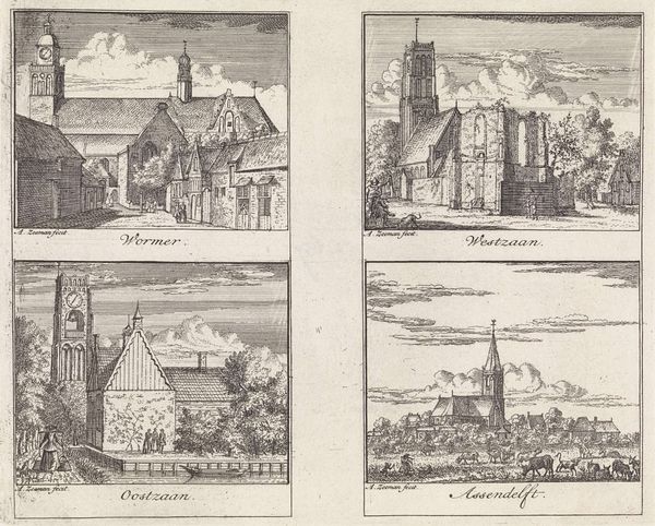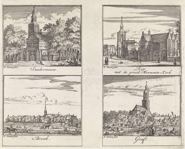 Editor: So, this is Abraham Zeeman's "Gezichten op Ransdorp, Landsmeer, Zunderdorp en Ilpendam," an engraving from 1732. It shows four little landscape vignettes. They feel… almost idyllic. I'm curious, what stories do you think these images tell about Dutch society at the time? Curator: Idyllic, perhaps on the surface. But let’s dig a bit deeper. This was the Dutch Golden Age, a period of immense wealth built, in part, on global trade and colonialism. Do you see how each vignette centres a church? What does that signify in terms of power structures and social control? How might these serene scenes obscure the realities of class division and global exploitation of resources and people? Editor: I hadn’t thought of it that way. I was focused on the calmness of the landscapes. The church dominating each scene makes sense given its importance in society. It's hard to see hints of exploitation here, but I can see how those factors underpinned Dutch society at the time. Curator: Exactly. Consider who is *not* represented. Where are the depictions of those whose labor fueled this prosperity? Or those who faced religious persecution? These prints participate in constructing a particular narrative – a controlled, prosperous, and undeniably Protestant Dutch landscape. We should be questioning whose stories get told and, perhaps more importantly, whose get left out? What do you make of the placement of each landscape within a rigid rectangle? Editor: It emphasizes the controlled nature, I suppose, almost as if these towns were specimens being catalogued. Is there a kind of statement about humanity's dominion over the land and maybe over others too? Curator: Precisely. These "views" offer not just depictions of places but also subtly reinforce a specific worldview. Keeping that in mind, do you see these landscapes differently now? Editor: I do. I'm more aware of the potential biases embedded within them and the larger historical context that shaped their creation. Thanks for bringing that perspective! Curator: It's all about looking beyond the surface, and understanding that art always exists within a complex web of power, identity, and history.