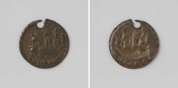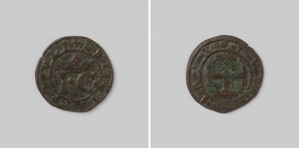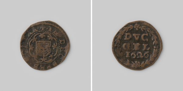 Curator: Here we have a Gelderse duit from 1633. It offers a glimpse into the visual and material culture of the Dutch Republic. Editor: My first impression is its stark materiality. The roughness of the metal and its clear signs of wear tell of a practical object that passed through many hands, bearing witness to everyday economic exchanges. Curator: Precisely. Notice the careful arrangement of inscriptions and heraldic symbols. The central monogram, surrounded by stylized foliage, projects an air of authority and stability. Its compact geometry ensures that it would be recognized even when worn. Editor: The foliage around the script gives it this halo effect, linking the ruler to more holy icons, or elevating the coin from a monetary tool to something carrying deeper national pride. Also interesting is how the wear gives the impression of age beyond its years. Curator: The very specific font used holds importance too. We can look at its influence of Baroque forms. It marks an engagement with artistic trends which speak of the period's aesthetics, expressing this official design language through a standardized metal casting process. Editor: The act of standardization feels very modern now, doesn't it? I wonder what it felt like then...this declaration of value through form and weight, something physical but representative. Curator: We might see the metal and engraving, coupled with design layout, as evidence of proto-industrial production methods starting to transform European society at the time. It’s a physical artifact of social standardization, slowly creeping through daily life! Editor: Considering the context, tracing how symbols become interwoven with identity gives us new angles on how individuals saw their place in Gelderland back then. A little coin carries immense layers of historical meaning. Curator: It offers quite the formal encapsulation, a compressed sign system intended to solidify meaning and communicate ideas of rulership! Editor: Indeed! Delving into what these symbols meant, and understanding its structure of composition offers so many compelling entry points for looking into cultural meanings, of then, and of now.