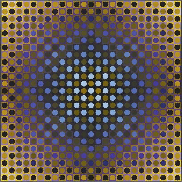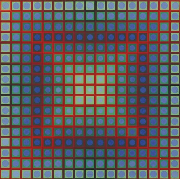 "Zilver" by Victor Vasarely presents a visually arresting experience through its calculated arrangement of geometric forms. Predominantly, you'll notice the composition is structured by a grid, populated with squares in black and white, and an inner rectangle with circles and squares in varied hues. Vasarely masterfully manipulates these elements to explore optical illusions and perception. The strategic placement of shapes and colours creates a sense of depth and movement, challenging our understanding of the flat picture plane. This visual play aligns with structuralist ideas, where meaning is derived from the relationships between signs within a system. Here, each shape and colour functions as a sign, contributing to the overall dynamic. The interplay between order and chaos, flatness and depth, invites us to question fixed perspectives. "Zilver" functions not just as a static image but as a dynamic field that challenges our perception and re-interprets visual language.