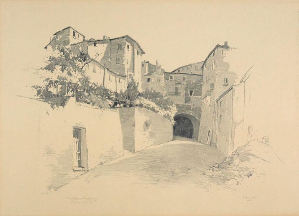 Editor: This is Dodge Macknight's watercolor, "Probably Fontvielle," at the Harvard Art Museums. The light in this painting is amazing, it makes me feel like I'm standing in the warm sun. What do you make of it? Curator: The shadows hold as much weight as the structures themselves, don't they? They suggest a history, a cultural memory embedded in the stones and tiles. Do you see how the artist uses color to evoke a sense of place, of time worn down and rebuilt? Editor: Definitely. The colors give it a sense of age. It almost feels like I've been there before. Curator: It’s that resonance, that feeling of familiarity, that makes symbols so powerful. I see the sun-drenched buildings as more than just architecture. For me, they embody perseverance, endurance. Editor: I never thought of it like that, but I see what you mean! Thanks for sharing your insight.