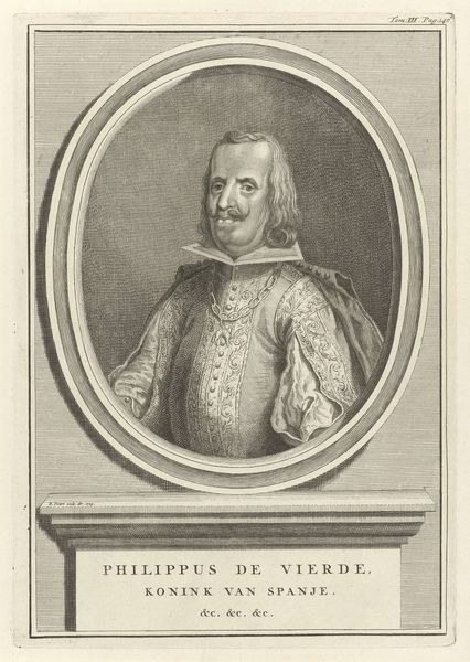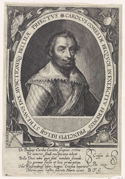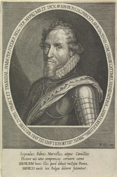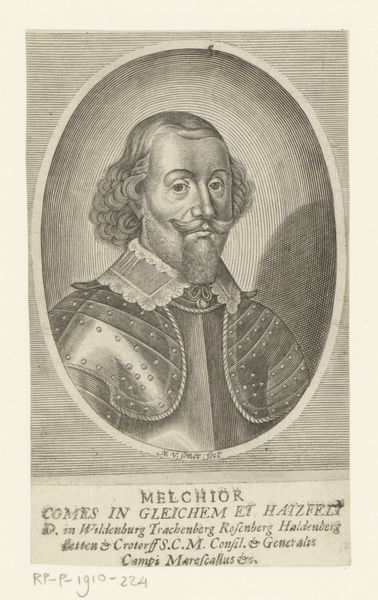Curator: What strikes me first about Wenceslaus Hollar's "Portrait of Thomas Howard, Earl of Arundel," created around 1639, is the intense detail rendered through engraving. Editor: My immediate impression is the sitter's embodiment of Baroque masculinity: power, wealth and status written all over his imposing presence. I see this portrait not just as an individual likeness, but as a carefully constructed representation of class and political authority at a pivotal moment in British history. Curator: Let's look at Hollar's technical mastery. The lines, forming shadow and light on Howard's face, achieve remarkable depth. And the text, forming a decorative element that grounds the whole composition and is very difficult to do so well in an engraving. What does that do for your intersectional view? Editor: It underscores the subject's importance! Howard wasn't just anyone; the text lists his titles: Earl of Arundel, Earl Marshal of England, and so on. It speaks to a very hierarchical society, reinforcing his position through visual representation at a time when the very concept of monarchy was increasingly embattled. He's presented, quite literally, as a pillar of the British establishment. Curator: The precision does elevate Howard, perhaps legitimizes him. The engraving style and circular framing evokes classical portraiture, another visual cue linking him to traditions of power and aristocracy. I suppose a modern viewer may well question that inherited authority? Editor: Exactly. And in thinking about visual construction, we need to address gender too. The armour and resolute gaze are intended to project strength. These choices resonate within larger patterns of gender and power representation prevalent in the Baroque era and even more so within contemporary issues. Curator: Well, looking beyond socio-political readings, Hollar’s work endures thanks to its virtuosic technique, don't you agree? He translated flesh and metal into pure line, something to admire beyond its cultural moment. Editor: But that technical virtuosity served a specific ideological function. Art isn’t made in a vacuum. By looking at technique through the lens of gender, race and class, we expose not only Howard's representation of power, but how such representation gets normalised in art, and more significantly, what the legacy of this entails. Curator: An insightful discussion. It seems we've shown that this piece is both a formal triumph and an echo of its historical moment. Editor: Precisely! Hopefully inviting modern viewers to examine both what's in the portrait and what created the conditions for it to exist.