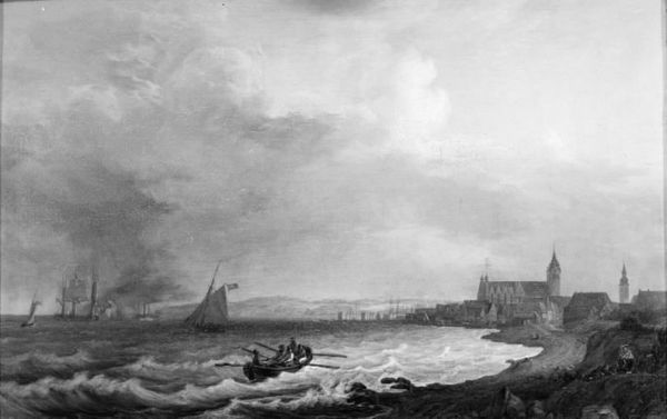 Editor: Here we have J.C. Dahl’s “Flat Beach by Sunset,” painted in 1826 using oil paints. It evokes such a somber, almost haunting, mood. How do you interpret this work? Curator: Let us observe the painting’s formal elements. Consider how the artist has orchestrated a visual language, first, through the heavy, textured sky, pressing down with dark, vertical strokes, in stark contrast to the flat, horizontal expanse of the beach. Does the interplay of light and shadow contribute to the mood you identified? Editor: Definitely. The limited tonal range makes the scene feel quite dramatic. The brushstrokes are really apparent, especially in the sky, and they contribute to that feeling of an approaching storm, maybe? Curator: Precisely. Note the positioning of the figures and the boat: diminutive and facing away, they amplify the sense of vastness, vulnerability, and perhaps insignificance in the face of nature's power. The diagonal placement of the boat directs the eye, creating dynamic movement but simultaneously underlining isolation. Do you agree? Editor: I hadn’t thought of it that way, but seeing the placement of the figures as you describe changes how I see the balance of the painting overall, the geometry. I appreciate you breaking down the interplay of brushwork, scale, and placement; it is more than just a scene, it is about form and emotional impact. Curator: Indeed. By examining the interplay between compositional elements like line, mass, and texture, we perceive the artwork’s ability to stimulate emotive engagement, and its enduring resonance beyond its surface portrayal.