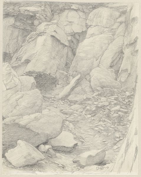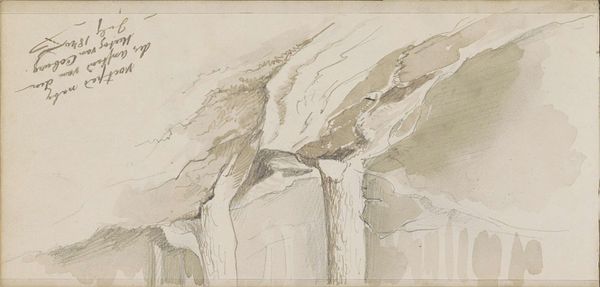 Curator: Standing before us is "Gespleten boomstammen in het park van Metternich bij Marienbad," a drawing completed in 1869 by Johannes Tavenraat. It is a delicate rendering in ink and watercolor on toned paper, now residing at the Rijksmuseum. Editor: There’s a starkness to it, isn’t there? Almost monochromatic, like looking at a charcoal study, even though we know watercolor is involved. These split trunks—they feel like broken sentinels in a silent park. The toned paper adds a layer of aged mystery to the entire scene. Curator: The use of a toned paper base is indeed intriguing. Its inherent hue invites the viewer to fill in the color, engaging memory of natural settings in autumn and winter, seasons symbolic of decline or dormancy. Also notice Tavenraat’s expert use of ink wash to define form and texture—remarkably modern for its time. Editor: Absolutely! He’s captured something so essentially forlorn. These stumps, relics of trees past, become more than just objects; they transform into symbols of loss, of time’s relentless march forward. The light seems to bleed away in the mist around the park and dead wood. There's a feeling that everything is on the verge of dissolving. Curator: Splitting, cutting, hewing trees down has a profound legacy across multiple traditions and regions. This resonates within cultures as distinct as ancient Celtic and far eastern cultures where reverence and careful extraction from old-growth forests dictated traditions and myths. Tavenraat taps into this, I believe, even unconsciously reflecting an era increasingly conscious of its relationship with the natural world. Editor: Which gives the work added resonance today, as our awareness of the scars we leave on the planet has, shall we say, intensified. It reminds us that even in seemingly tranquil landscapes, there's often a story of change, sometimes violent, underlying the surface. This piece whispers volumes, even in its subdued palette. Curator: Indeed. Tavenraat offers a study more significant than simply a visual sketch. Editor: It lingers, this landscape. A poignant observation.