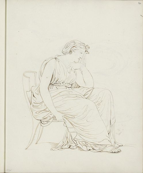 Here is the audio guide script about "Vrouw in een tuniek, naar klassiek voorbeeld" by jonkvrouw Elisabeth Kemper. In this drawing, Elisabeth Kemper captures a woman in a tunic, rendered with delicate lines and minimal shading. The composition centers on the figure, whose classical drapery and serene expression evoke a sense of timelessness. The use of line is particularly striking; it defines form and creates a sense of volume, while the limited tonal range emphasizes the purity of line and shape. Kemper’s choice to depict the subject in this way reflects a broader interest in classical ideals of beauty and form during her time. The drawing engages with notions of representation and the construction of idealized forms, inviting viewers to contemplate the relationship between art and reality. The artwork does not offer a singular, fixed meaning but remains a site of ongoing interpretation and re-interpretation.