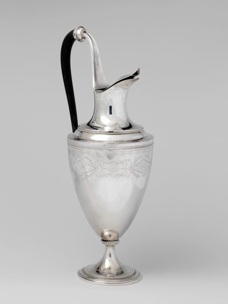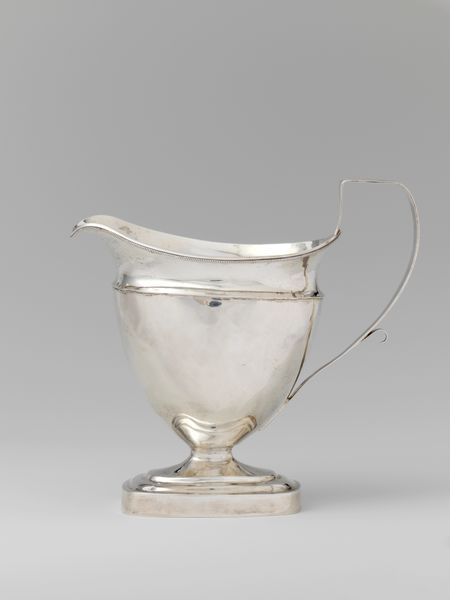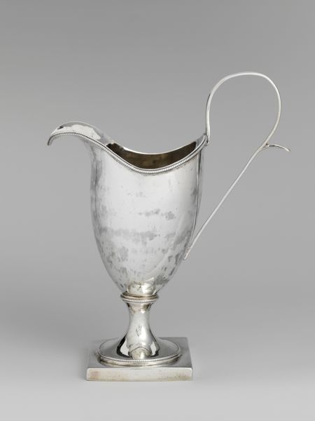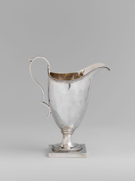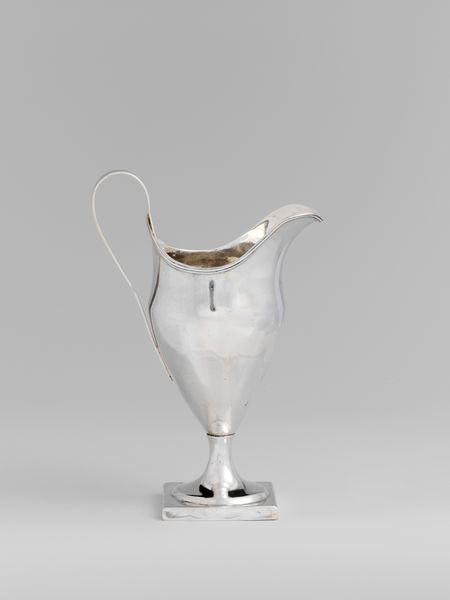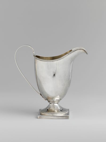 William W. Gilbert crafted this creampot from silver, sometime in the late 18th or early 19th century. Its reflective surface and elegant form immediately draw the eye. The piece is structured around a balance of geometric and organic elements. The octagonal base anchors the design, providing a stable foundation for the slender, flaring stem. The body of the creampot swells gently upwards, its smooth surface interrupted by delicate, engraved floral patterns which soften the metallic rigidity. Observe how the handle, a simple, elongated curve, contrasts with the more ornate detailing of the body, creating a dynamic tension. The creampot exemplifies the period's interest in neoclassicism, blending functionality with refined aesthetics. The interplay of light on its surface, and the balance of line and form, speak to a culture deeply invested in visual harmony and the subtle expression of status through everyday objects. This creampot isn't just a vessel; it's a statement, reflecting the values and tastes of its time.