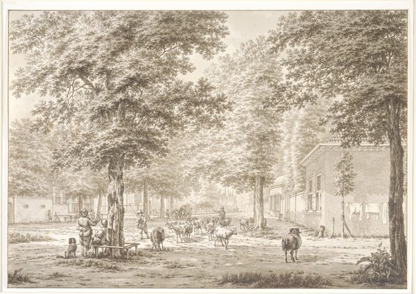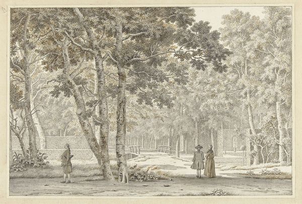 Hermanus van Brussel created this delicate view of the Haarlemmerhout with watercolor and ink. Look closely, and you'll notice the artist's careful layering of washes, a technique demanding patience, and control of the liquid medium. The paper itself, likely handmade, has a subtle texture that enhances the painting's luminous quality. The artist's skilled hand created an idyllic scene, where the people who frequented the park were able to relax and enjoy their leisure time. It's fascinating to consider this artwork in its historical context. During the 18th and 19th centuries, watercolor painting was especially popular among the upper classes. As a relatively accessible and portable medium, it was favored for recording scenes from nature and daily life. But don't let the modest scale fool you - this intimate artwork provides a window into the social customs and values of the time.