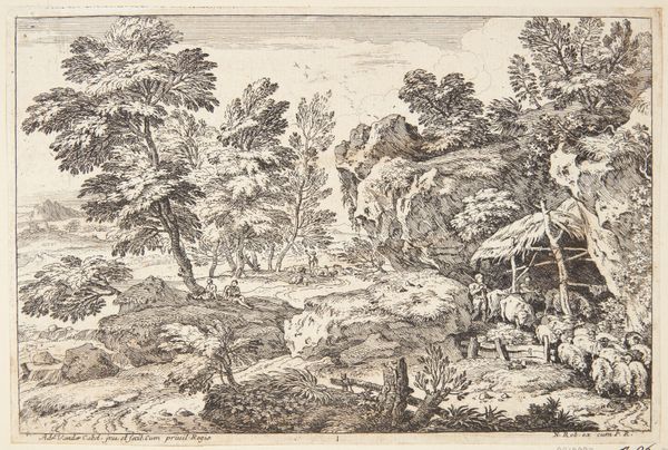 Editor: Here we have Allart van Everdingen’s "The Unloading of the Barge," a woodcut print dating from the mid-17th century. It’s a small scene, very detailed. The contrast is stark between light and shadow. It depicts people working and travelling near a village. I find it to be a humble, almost uneventful scene. What can you tell us about this artwork, considering its historical and social context? Curator: Well, prints like this played a vital role in shaping perceptions of the Dutch landscape. Everdingen, along with his contemporaries, was instrumental in creating a distinct national imagery during the Dutch Golden Age. This "realism" you see isn't just a faithful depiction, it's a carefully constructed image meant to evoke certain feelings of national pride and identity. Notice the busy workers, the detailed buildings. How do you think that reflects the Dutch society of the time? Editor: It definitely gives off an impression of industry and community, almost like a celebration of Dutch life. Were prints like these widely accessible? Curator: Yes, and that's crucial. Prints were relatively affordable and could circulate widely. They were collected in albums, traded, and used for decorative purposes, shaping the visual culture of the time. Everdingen himself traveled extensively, and his prints, disseminated throughout the region, contributed to the popularity and standardization of certain landscape motifs. They promoted a sense of shared identity. This imagery influenced not only art but also other cultural products. Editor: It's fascinating to think about how this small print was actually a powerful tool in shaping a sense of Dutch identity. Thanks for providing that context! Curator: Absolutely. Considering the socio-political influence of artworks allows us a new appreciation of what role these art pieces held.
